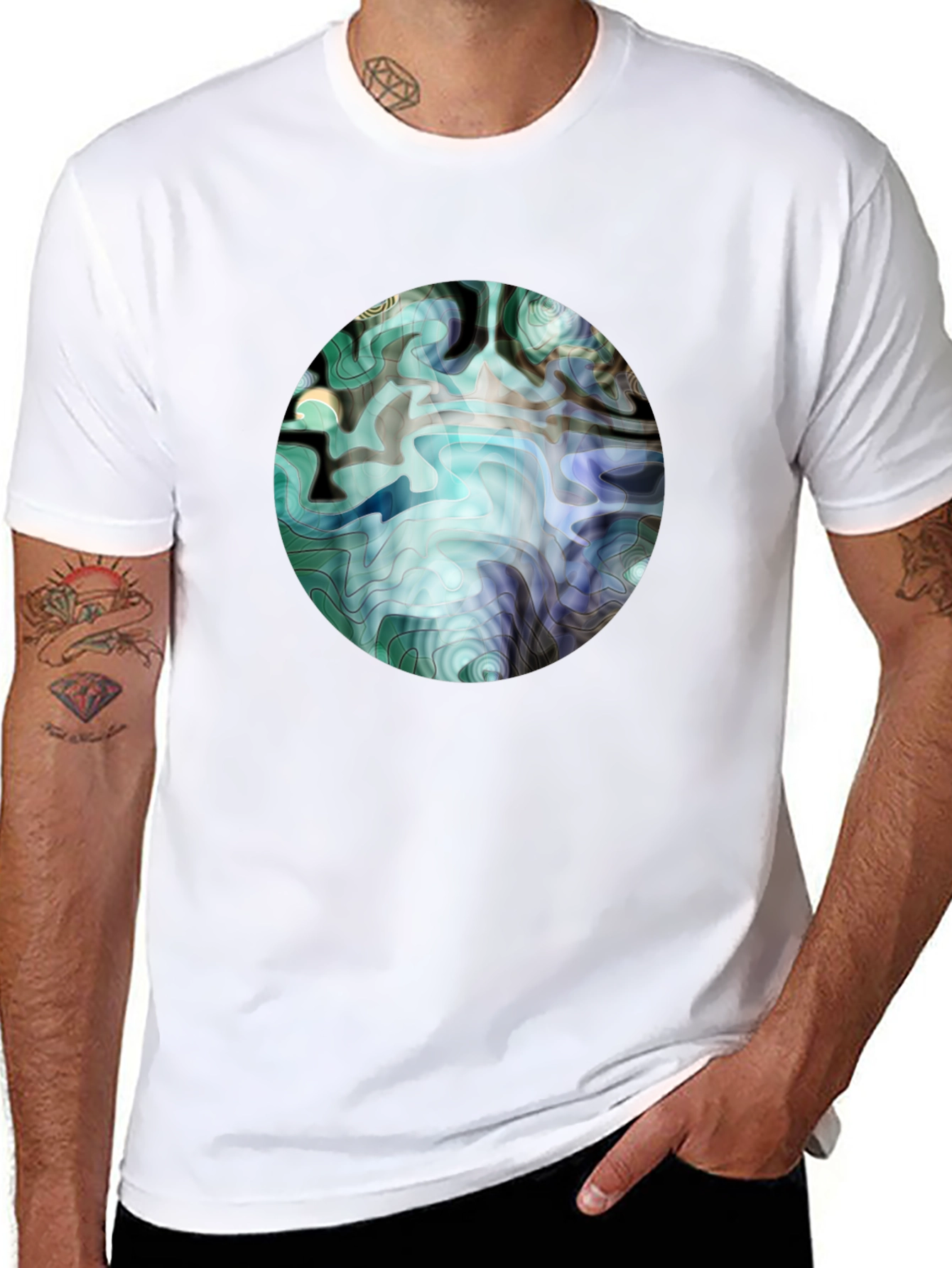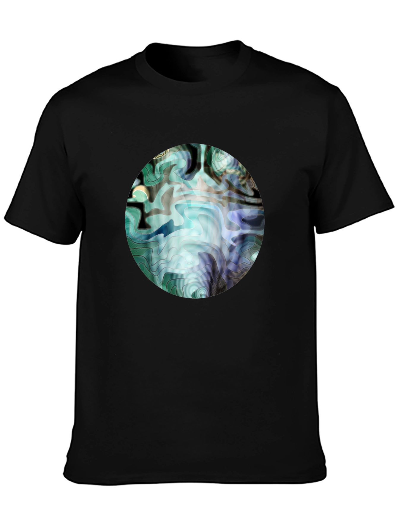 This modern black t-shirt features a unique, abstract graphic print. The design, a circular pattern with swirling lines of teal, blue, and grey, creates a visually striking centerpiece. Made from a soft, breathable fabric, this tee offers comfort and style. The classic crew neck and short sleeves make it perfect for everyday wear, while the bold graphic adds a touch of individuality. Dress it up with dark jeans for a night out or pair it with shorts for a casual weekend look. A stylish choice to elevate any outfit.