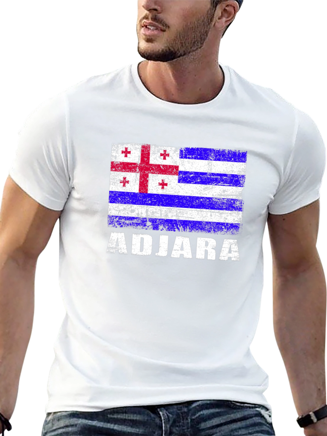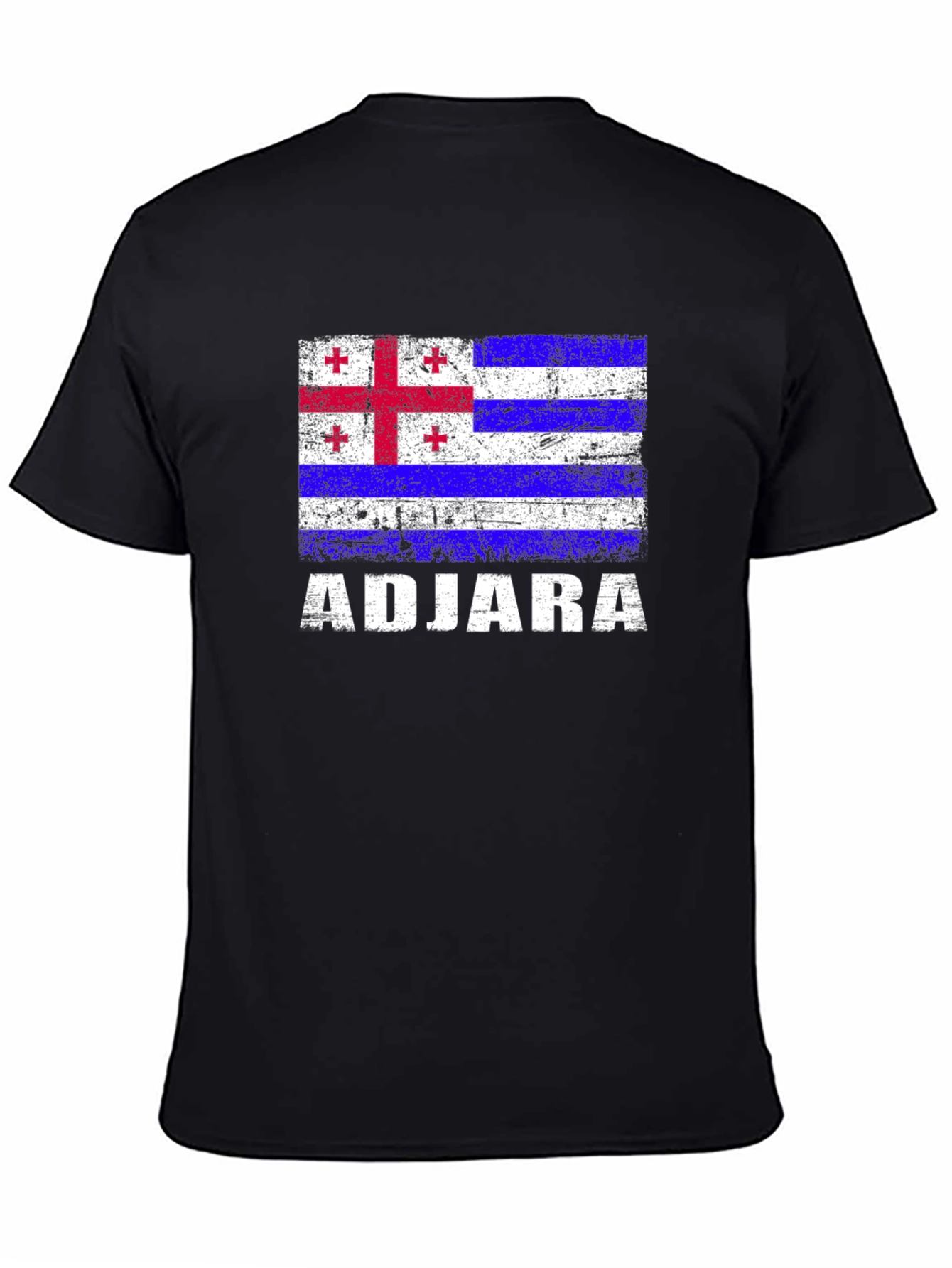 Show your pride with this unique Adjara flag t-shirt! This black tee features a distressed Adjara flag graphic, combining the Georgian flag with the blue and white stripes. The word "ADJARA" is prominently displayed beneath the flag design. Made from comfortable cotton, this short-sleeved shirt is perfect for casual wear. It's a great way to celebrate your heritage or show your love for Adjara. Ideal for everyday use, sporting events, or as a thoughtful gift. Grab yours today!