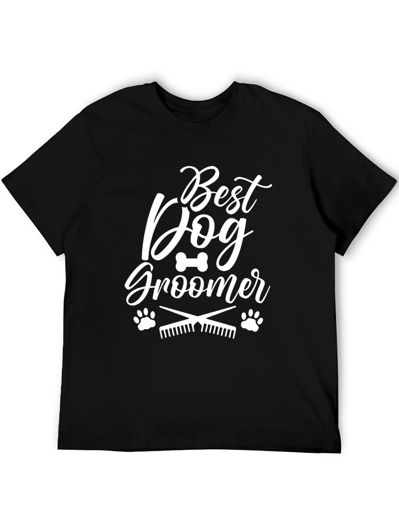 Showcase your love for dogs and grooming with this stylish black t-shirt. The shirt features a crisp, white graphic design that reads "Best Dog Groomer" in an elegant, eye-catching font. Accented with adorable paw prints, combs and a bone, it's the perfect way to express your passion for pet care. Made from a comfortable-looking fabric, this tee is ideal for everyday wear, whether you're at work, running errands, or just relaxing at home. A must-have for any dedicated dog groomer, it's a fun and fashionable way to show off your profession.