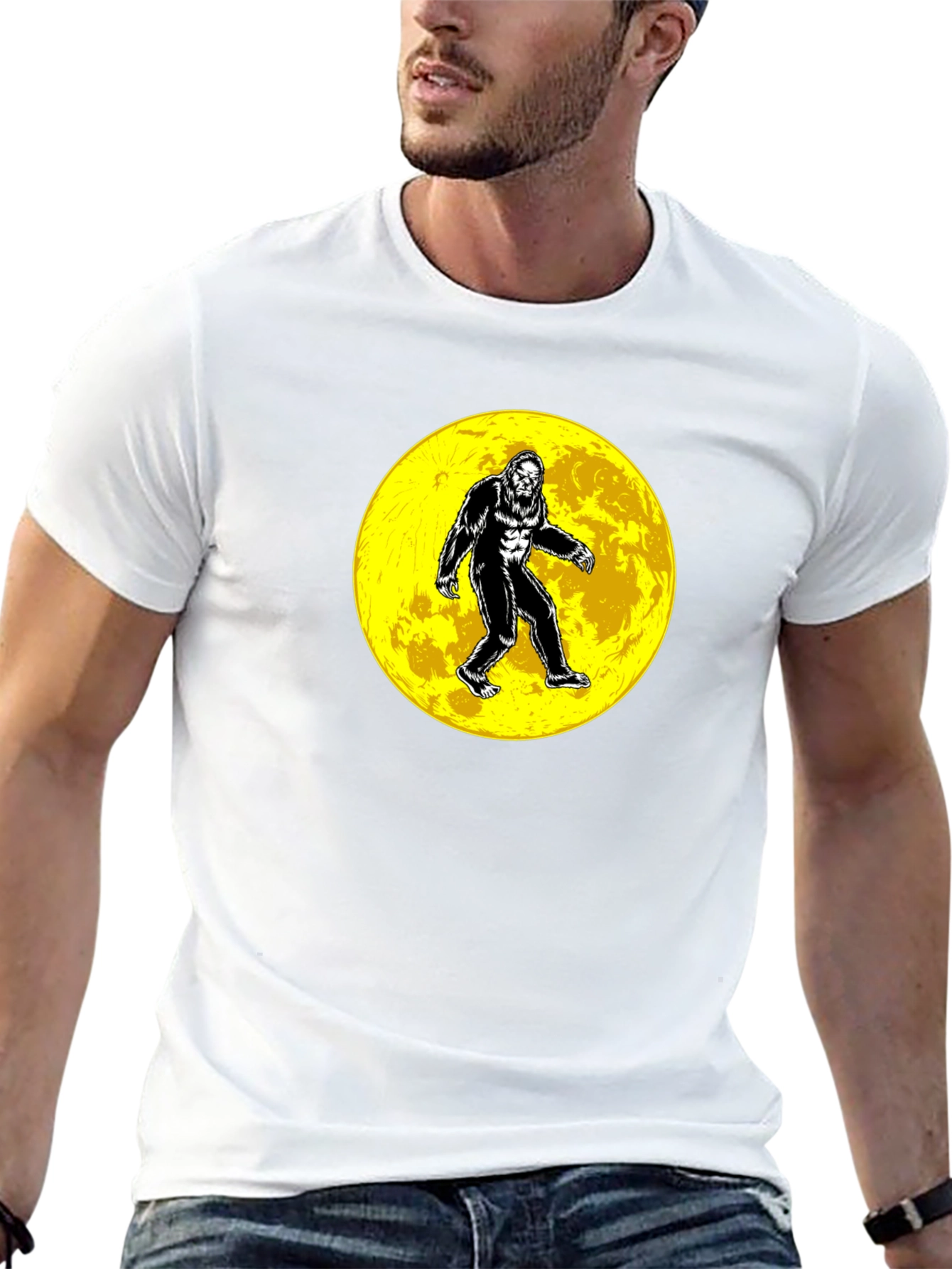 Embrace the mystique with this unique black graphic tee. The shirt features a bold illustration of Bigfoot silhouetted against a vibrant yellow full moon. Made from comfortable cotton fabric, this tee offers a relaxed fit perfect for everyday wear. The eye-catching design makes a statement, ideal for casual outings, concerts, or simply expressing your unique style. Show off your love for cryptids and stand out from the crowd with this one-of-a-kind Bigfoot tee. A must-have for believers and fans of the unexplained. It is a comfortable shirt that can be worn in a variety of casual settings.