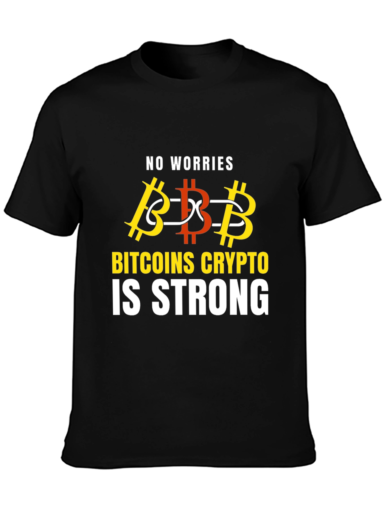 Show your support for cryptocurrency with this eye-catching black T-shirt. This comfortable tee features a unique graphic design with three Bitcoin symbols in yellow and orange, overlaid with the text "NO WORRIES" and "BITCOINS CRYPTO IS STRONG" in bold, white font. Made from a soft, breathable fabric, this shirt is perfect for everyday wear. Whether you're a crypto enthusiast, investor, or simply love cutting-edge technology, this T-shirt lets you express your passion with style and confidence. It's a great conversation starter and a must-have addition to any modern wardrobe. Ideal for casual outings, tech conferences, or just lounging around.