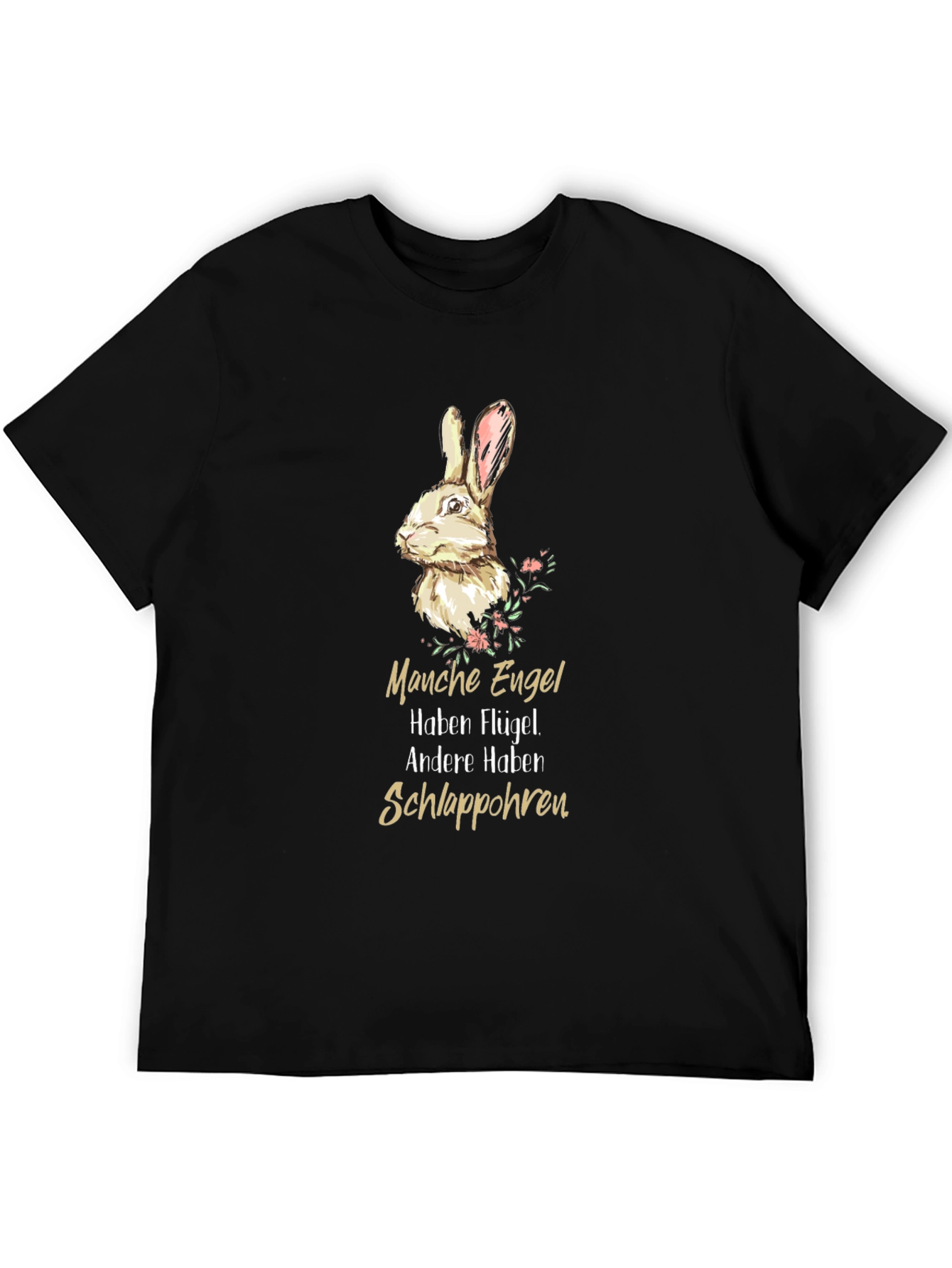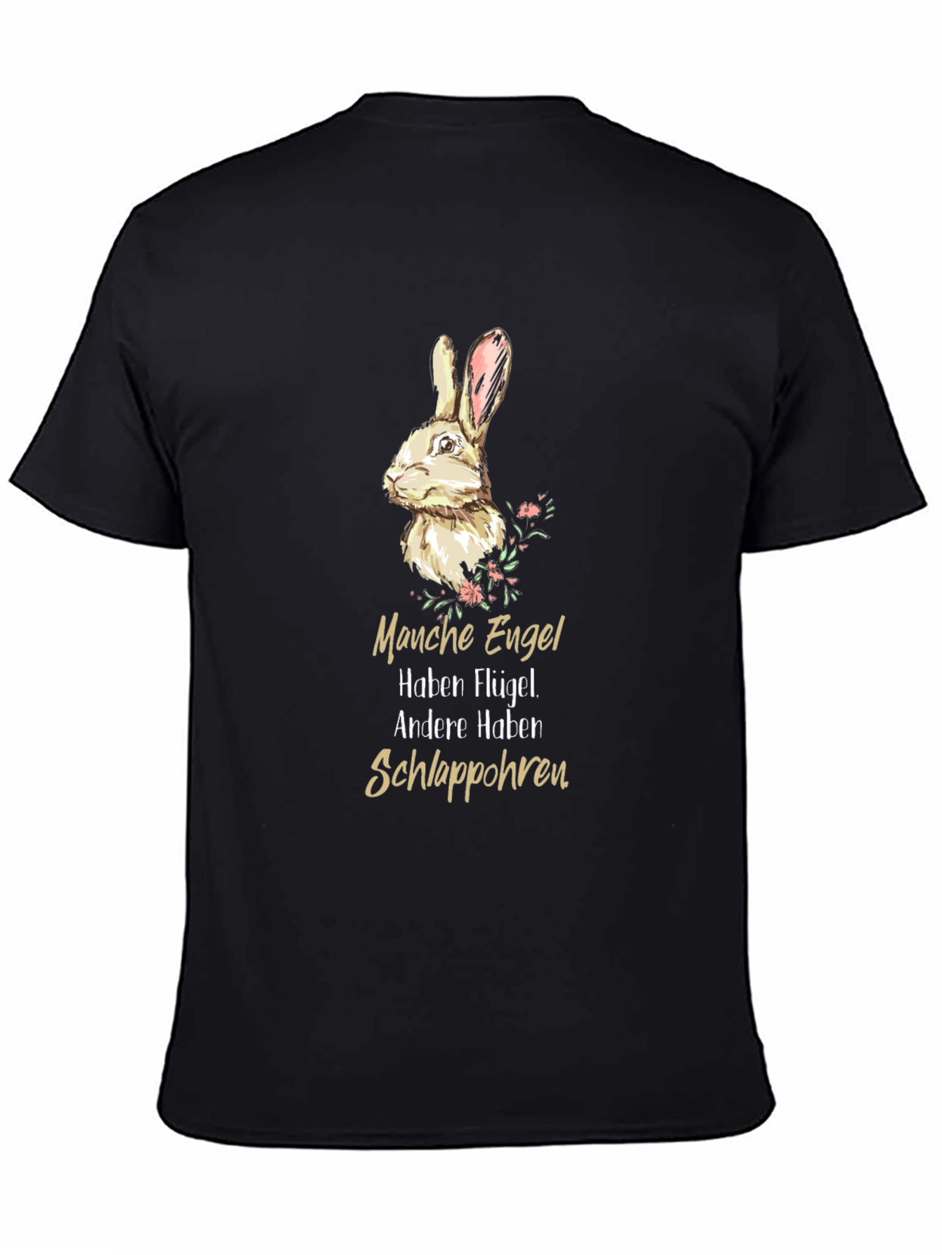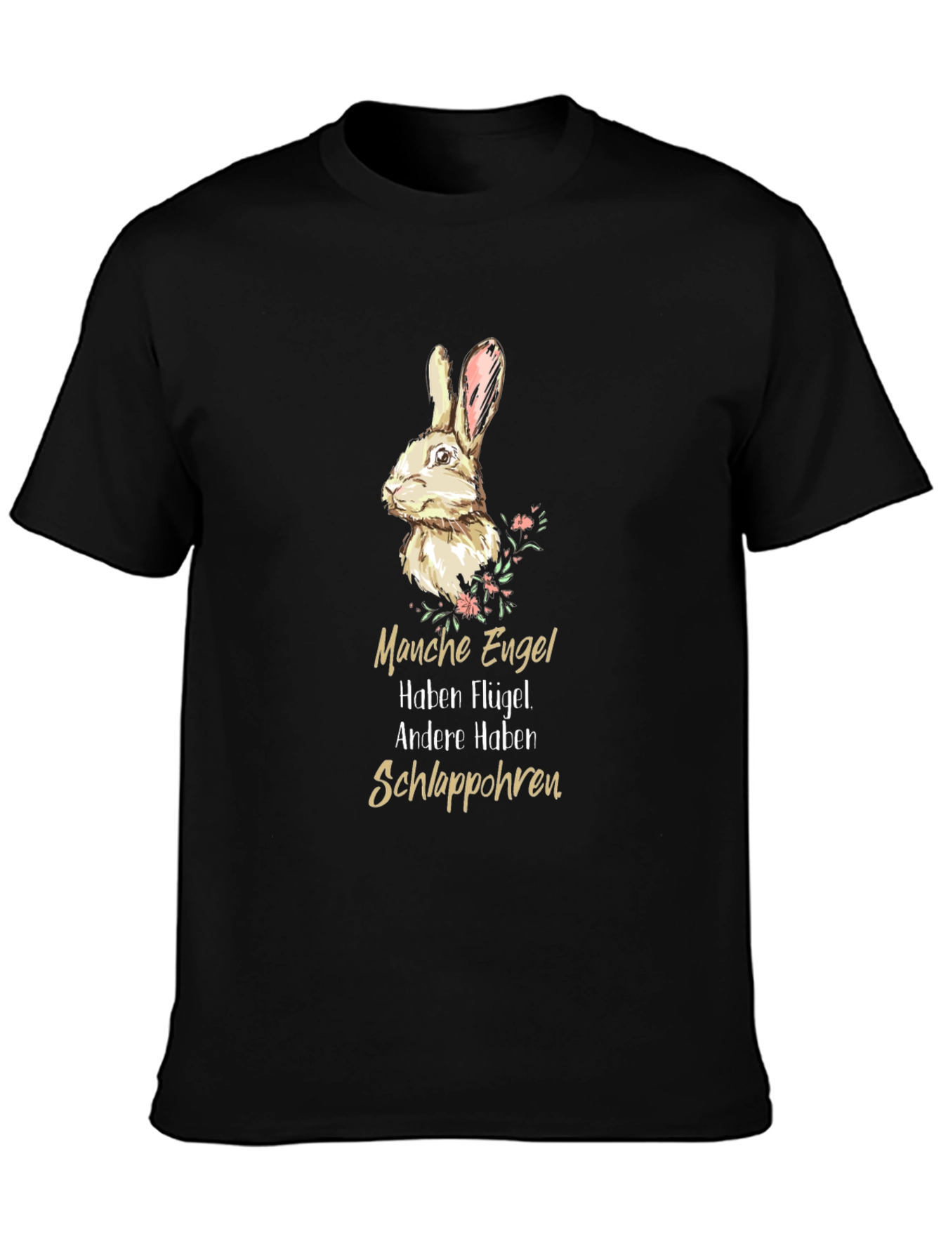 Showcase your unique style with this eye-catching black t-shirt featuring a charming bunny rabbit design. The soft, comfortable fabric ensures all-day wearability. This shirt features an artistic illustration of a bunny rabbit accompanied by the german text "Manche Engel Haben Flügel, Andere Haben Schlappohren" in an elegant font, adding a touch of whimsy and charm. Perfect for casual outings, social gatherings, or simply relaxing at home. This unique tee makes a great gift for animal lovers and those with a quirky sense of humor.