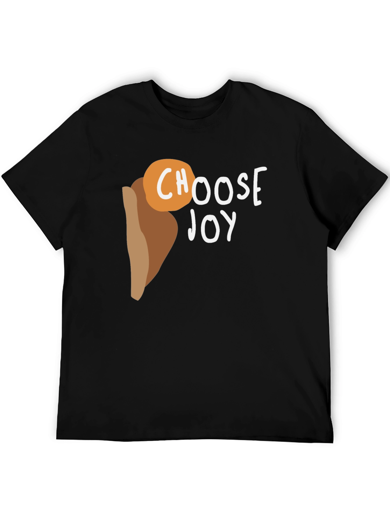 Spread positivity with this black cotton graphic tee. The shirt features a unique design with a brown hand holding an orange orb over which is written 'CHOOSE JOY'. The design offers a simple yet motivational message. Made from soft, breathable cotton, this tee is comfortable for everyday wear. Perfect for casual outings, layering, or as a statement piece to uplift your day. Show off your optimistic outlook with this eye-catching and comfortable t-shirt. Dress with style and positive vibes!