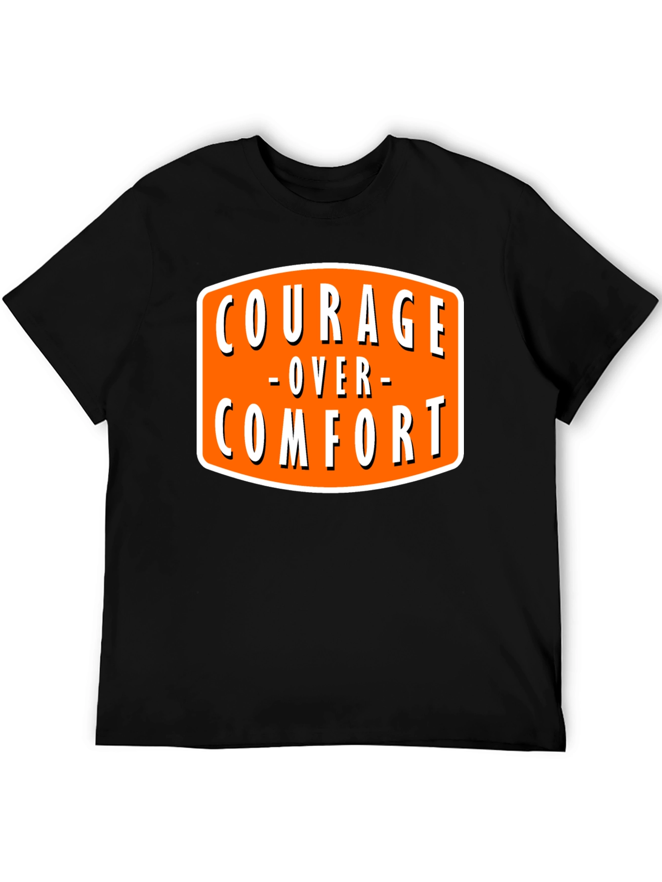 This black t-shirt features a bold and motivational graphic. The design showcases the phrase "COURAGE -OVER- COMFORT" in white lettering against an orange background with a white outline, making it a visually striking piece. The t-shirt appears to be made from a soft, comfortable fabric, perfect for everyday wear. The classic fit ensures a relaxed and flattering silhouette. Ideal for individuals seeking inspiration or those who appreciate statement apparel, this t-shirt is a great conversation starter. Wear it to the gym, casual outings, or as a reminder to embrace challenges in your daily life. This tee combines comfort with a powerful message.