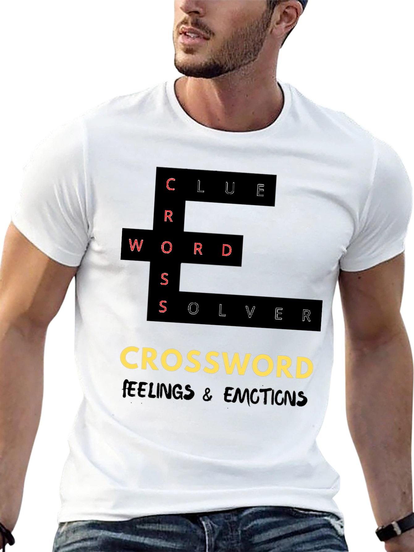 Show off your puzzle prowess with this stylish black graphic tee. Featuring a bold "CROSSWORD" design with "FEELINGS & EMOTIONS" underneath, it's perfect for crossword enthusiasts. The creative arrangement of the words "CLUE", "WORD", and "SOLVER" adds a unique twist. Made from comfortable fabric, this tee is ideal for casual wear, game nights, or as a gift for the word wizard in your life. Express your love for puzzles with this eye-catching and clever t-shirt.