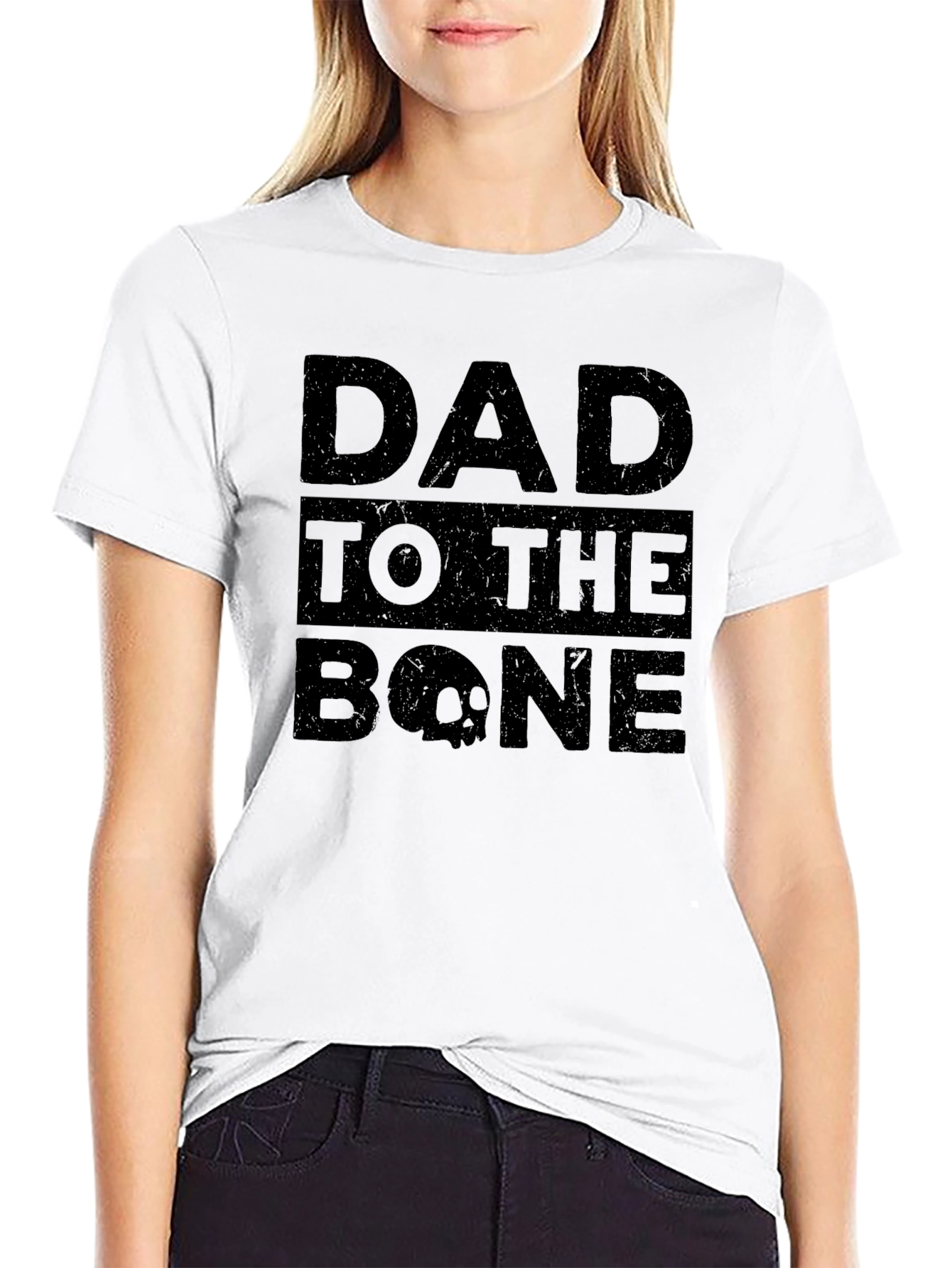 Show off your love for fatherhood with this black "Dad to the Bone" graphic t-shirt. The design features bold lettering with a skull subtly integrated into the word "BONE", adding a touch of edgy style. Made from what appears to be a soft, breathable cotton blend, this tee provides all-day comfort. The classic fit and short sleeves make it perfect for casual wear, whether you're running errands, spending time with the family, or simply relaxing at home. A great gift for any cool dad.