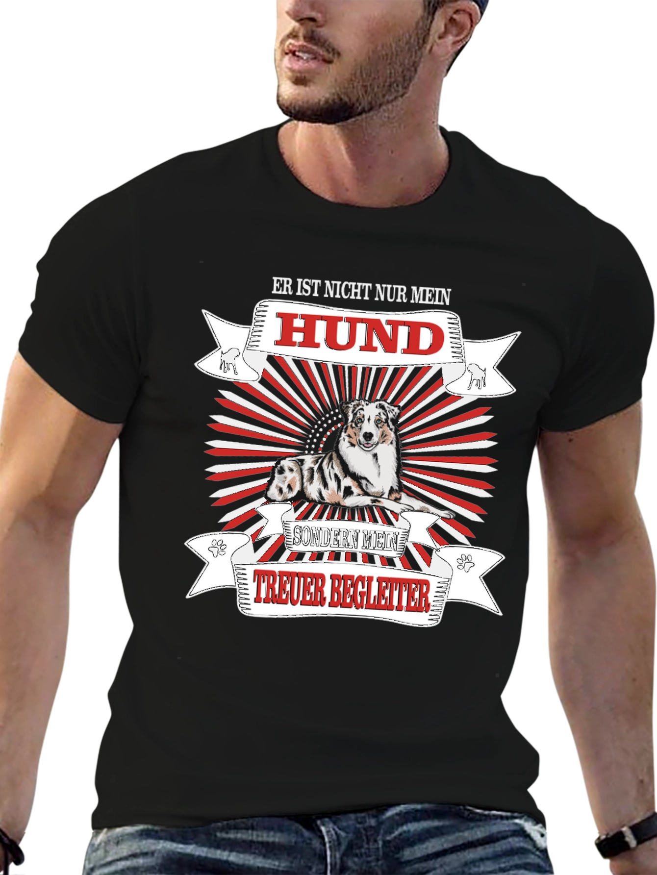 Show your love for your furry friend with this unique t-shirt. Featuring a striking graphic of a dog with a red and white sunburst design, it reads "ER IST NICHT NUR MEIN HUND SONDERN MEIN TREUER BEGLEITER". This shirt is perfect for dog owners who see their pets as more than just animals, but as loyal companions. The design is printed on a black, comfortable t-shirt, making it ideal for everyday wear or as a thoughtful gift for the dog lover in your life. Wear it proudly and let everyone know how much your dog means to you! Perfect for casual outings, dog walks, or lounging at home.