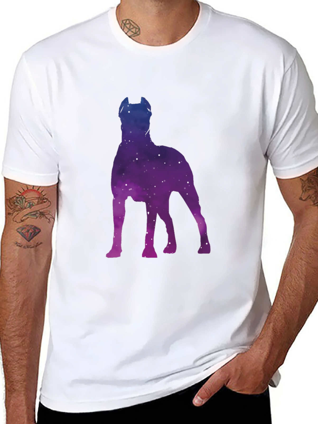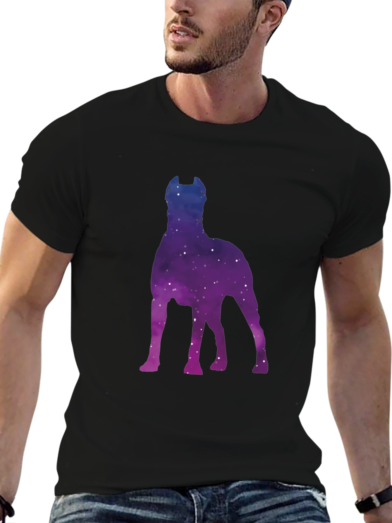 Showcase your love for dogs and the cosmos with this unique black T-shirt! Featuring a striking galaxy-filled silhouette of a dog, this tee is a stylish and eye-catching piece. The vibrant blend of blues and purples against the black backdrop makes the design pop. Made from comfortable material, this T-shirt is perfect for everyday wear, casual outings, or as a gift for dog lovers and astronomy enthusiasts alike. It's a simple yet bold statement piece that's sure to turn heads and spark conversations.