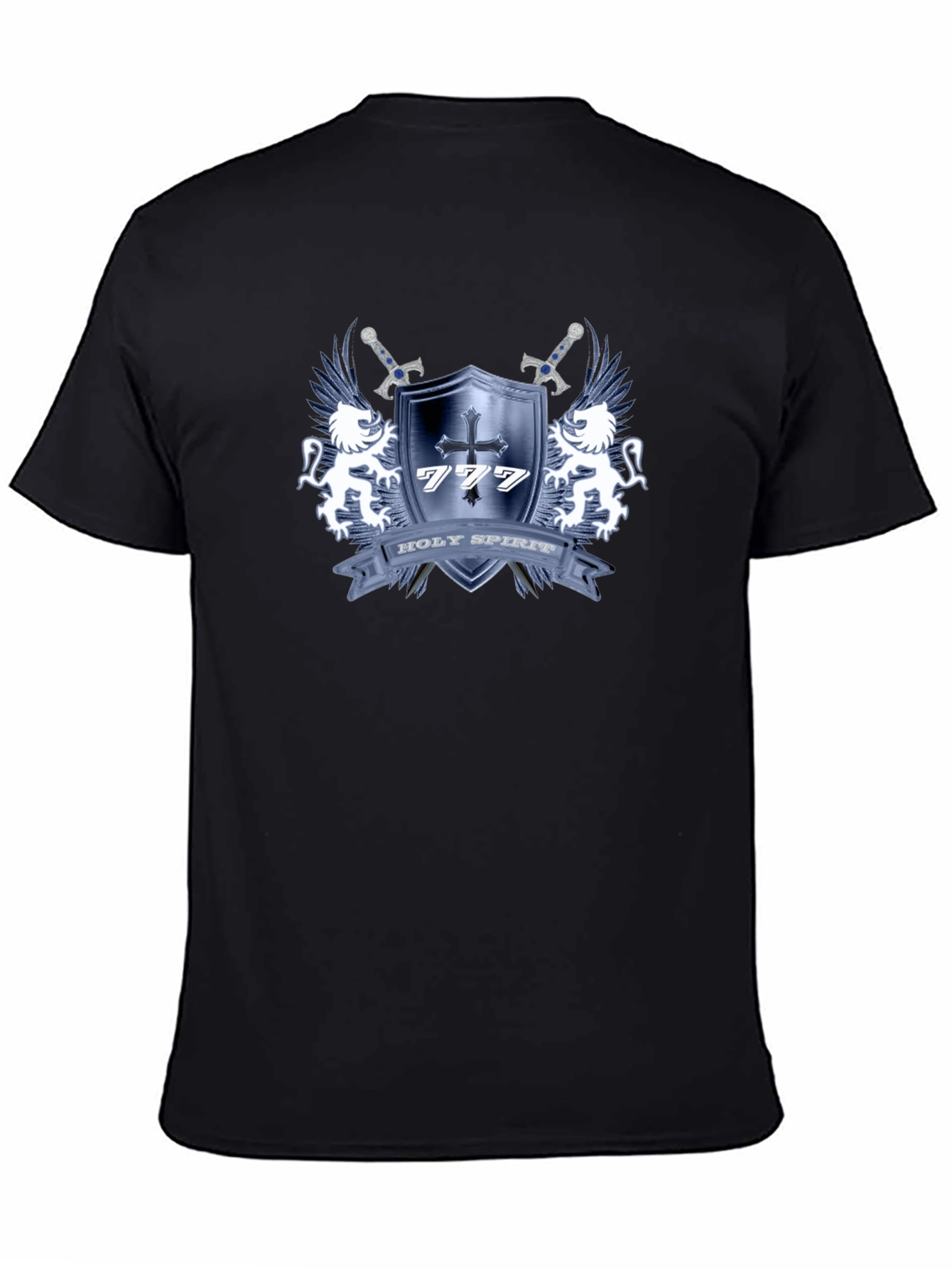 Show your faith with this striking black t-shirt featuring a bold graphic shield design. The emblem showcases a cross, the number 777, and the words "Holy Spirit" prominently displayed. Flanking the shield are white heraldic lions and crossed swords, all rendered in detailed, artistic style. Made from comfortable, breathable fabric, this tee is ideal for everyday wear, religious gatherings, or as a conversation starter. The impactful design makes a statement of belief and adds an element of edgy style. A versatile piece to express your spiritual side.