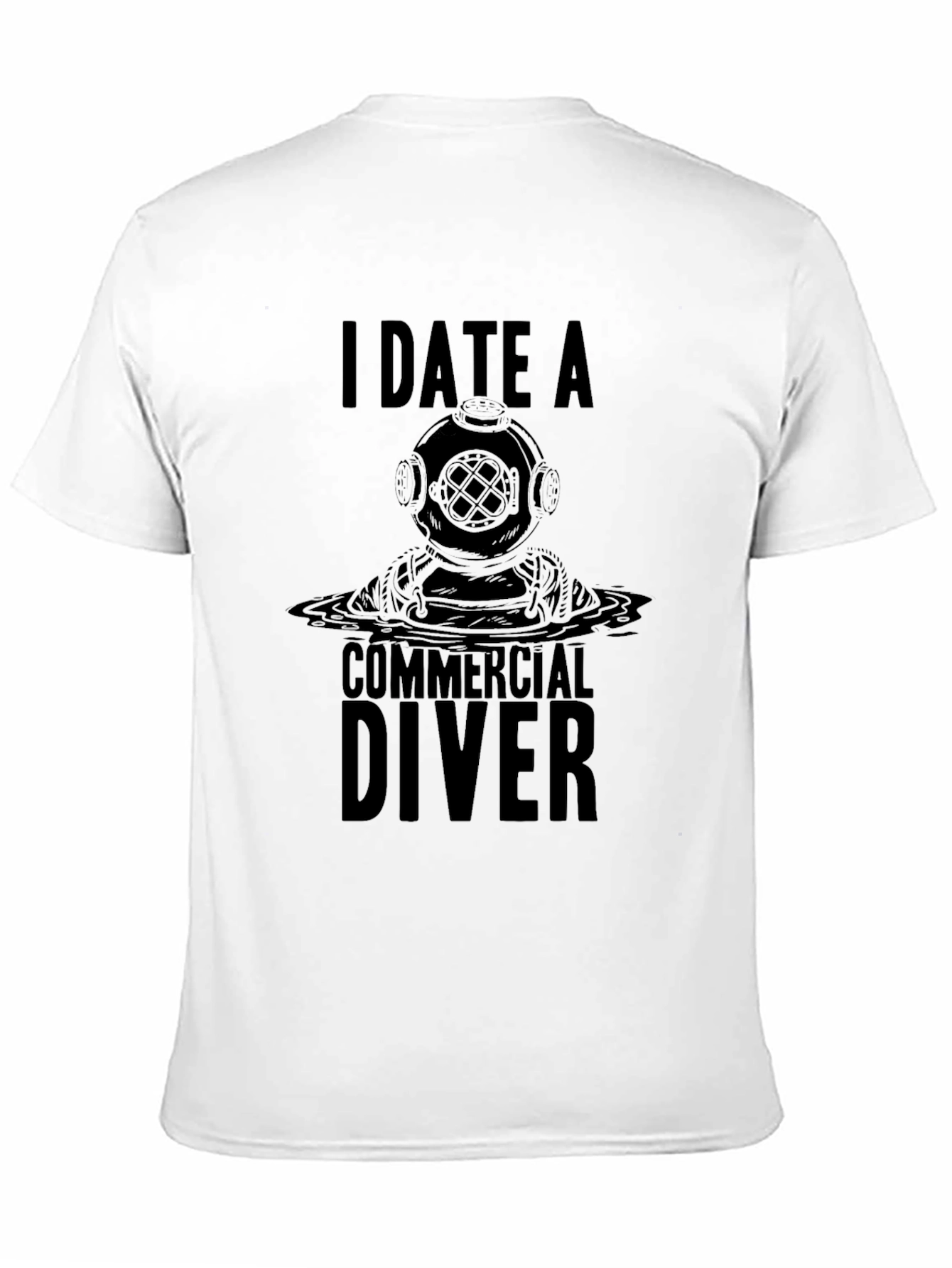 Show your support for your significant other's profession with this bold graphic t-shirt. Made from a comfortable, breathable fabric (assumed), this black tee features a striking design with the text "I DATE A" above an illustration of a vintage diving helmet, followed by "COMMERCIAL DIVER" underneath. Perfect for casual wear, diving events, or as a thoughtful gift. Wear it proudly to showcase your connection to the world of commercial diving. Make a statement with this conversation-starting piece!