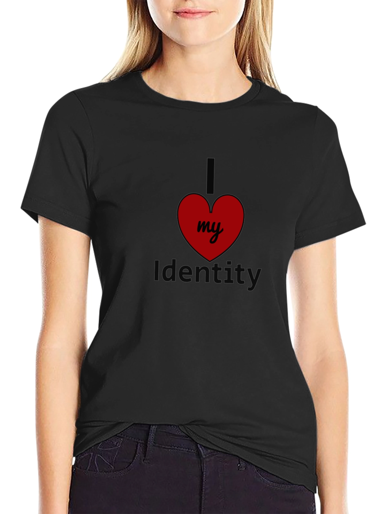 Show off your individuality with this stylish black T-shirt. This tee features a unique design with an "I" above a red heart containing "my" and then "Identity" printed below the heart. Made from soft, breathable fabric, this shirt offers superior comfort and a relaxed fit, perfect for everyday wear. Its versatile black color makes it easy to pair with jeans, shorts, or joggers for a casual yet fashionable look. Whether you're running errands, hanging out with friends, or expressing your unique self, this shirt is sure to turn heads and spark conversations. A must-have addition to any wardrobe!