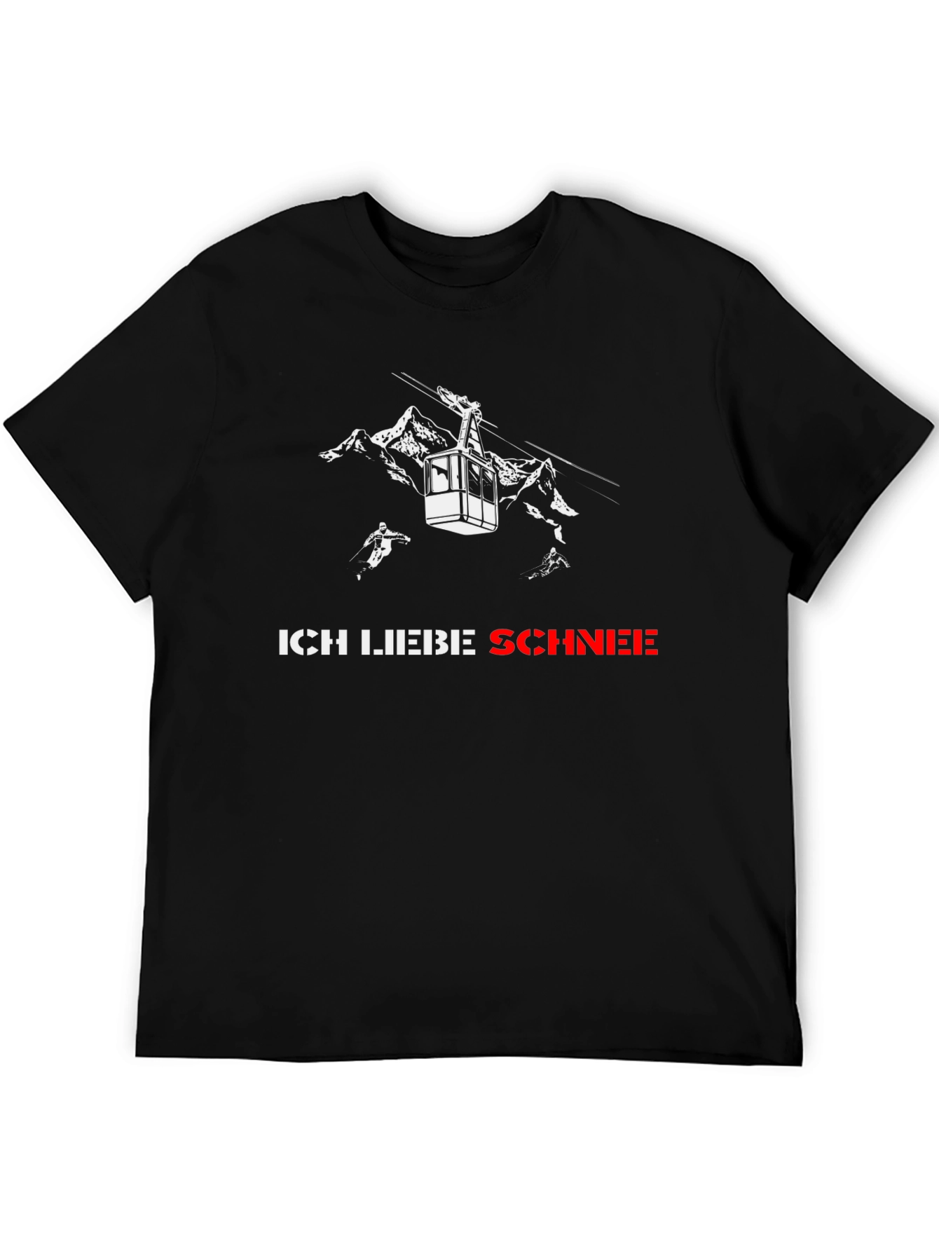 Embrace your love for snow with this stylish black t-shirt. Featuring a crisp graphic design of a mountain cable car and skiers, this tee is perfect for winter sports enthusiasts. The bold white and red lettering "Ich Liebe Schnee" adds a touch of international flair. Made from comfortable, breathable fabric, this shirt is ideal for casual wear, hitting the slopes, or cozying up by the fire. Show off your passion for skiing and snowboarding with this unique and eye-catching t-shirt.