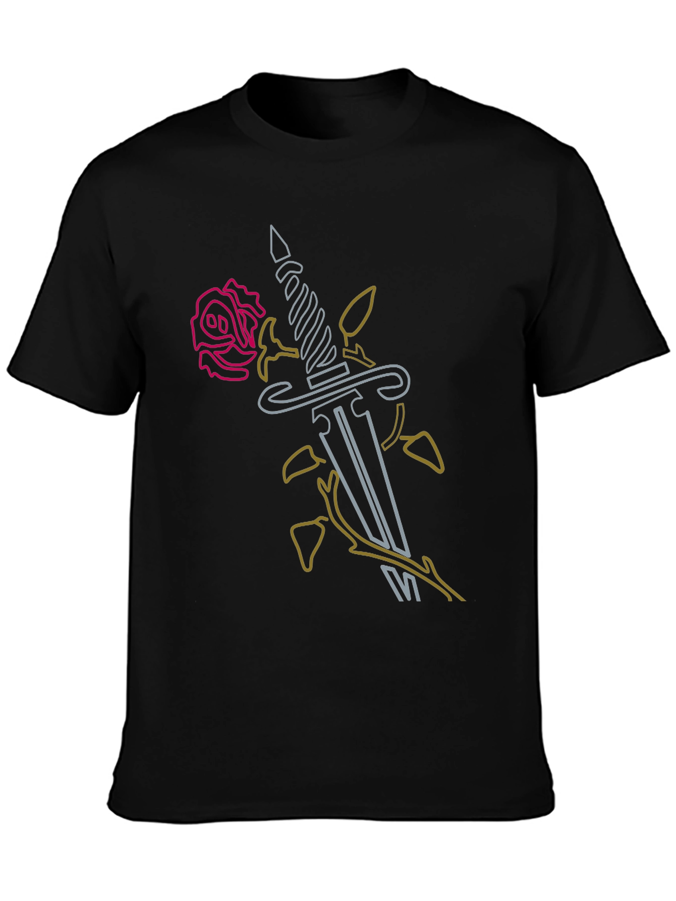 Make a statement with this bold black t-shirt featuring a striking graphic design. A vibrant rose and dagger intertwine in a unique and edgy illustration, perfect for expressing your individuality. This tee offers both comfort and style. The clean lines and eye-catching design make it a versatile addition to any wardrobe. Wear it casually with jeans or dress it up with a jacket for a night out. A must-have for those who appreciate bold, artistic fashion!