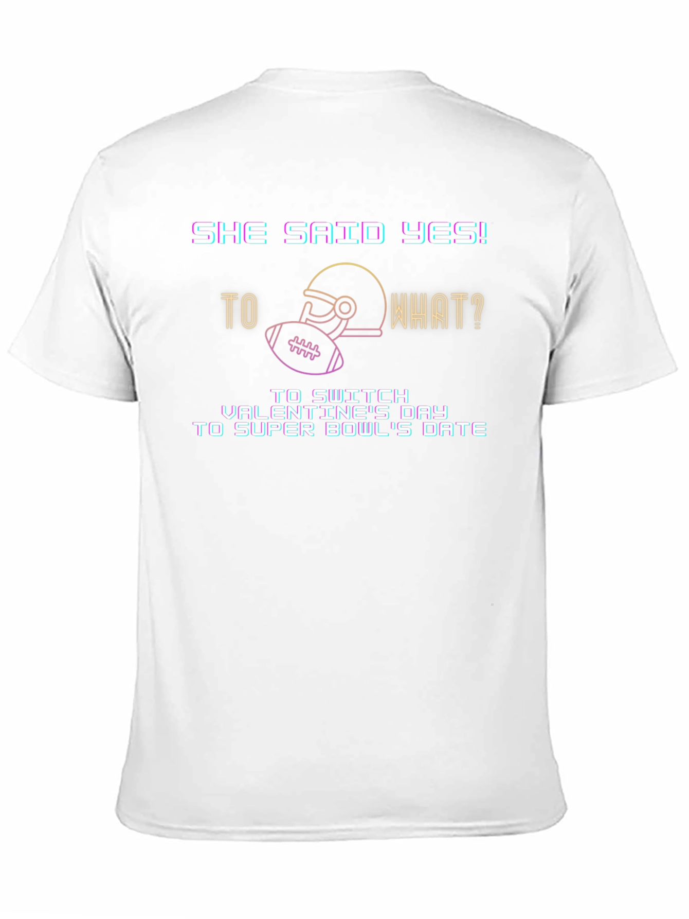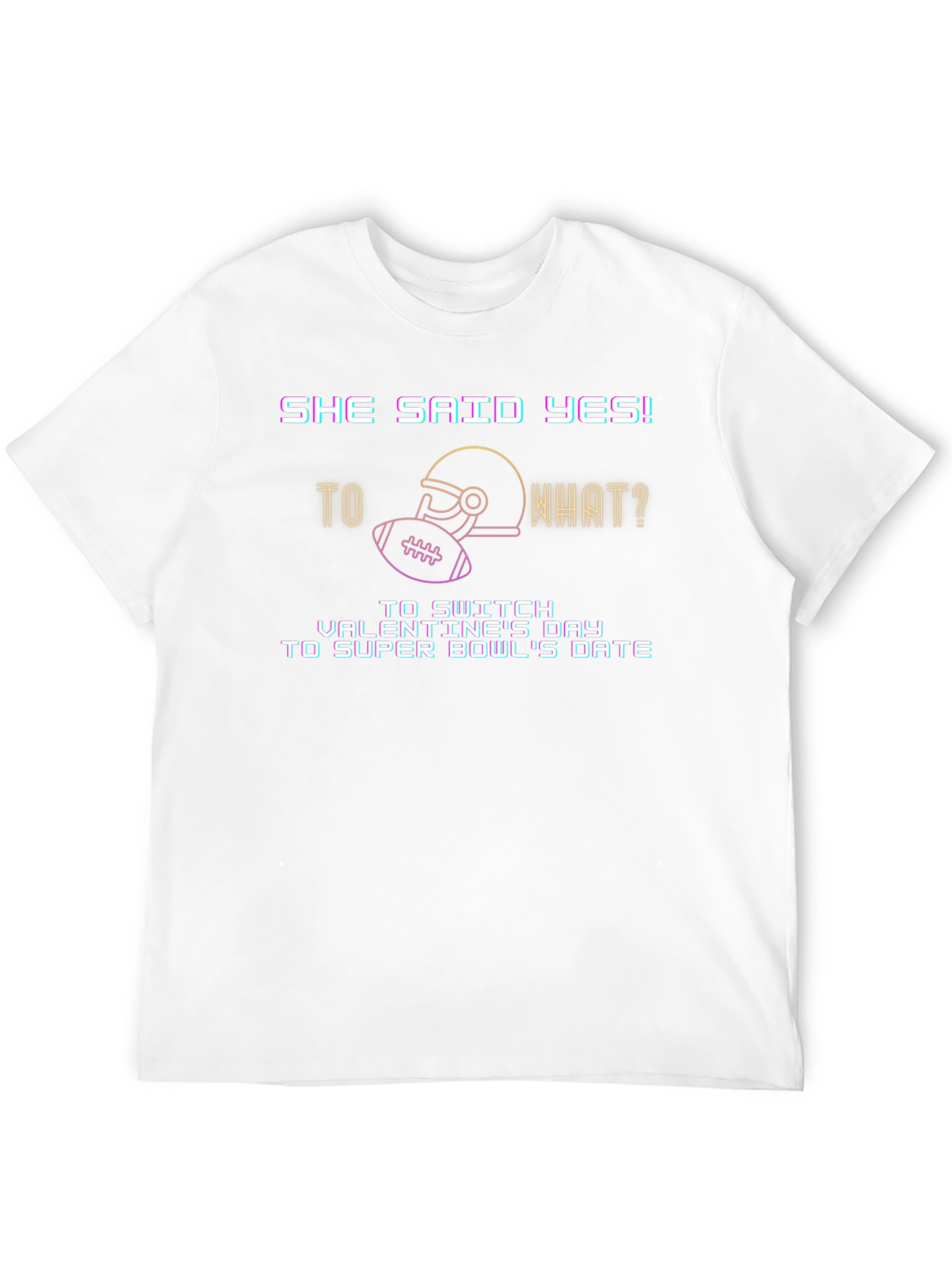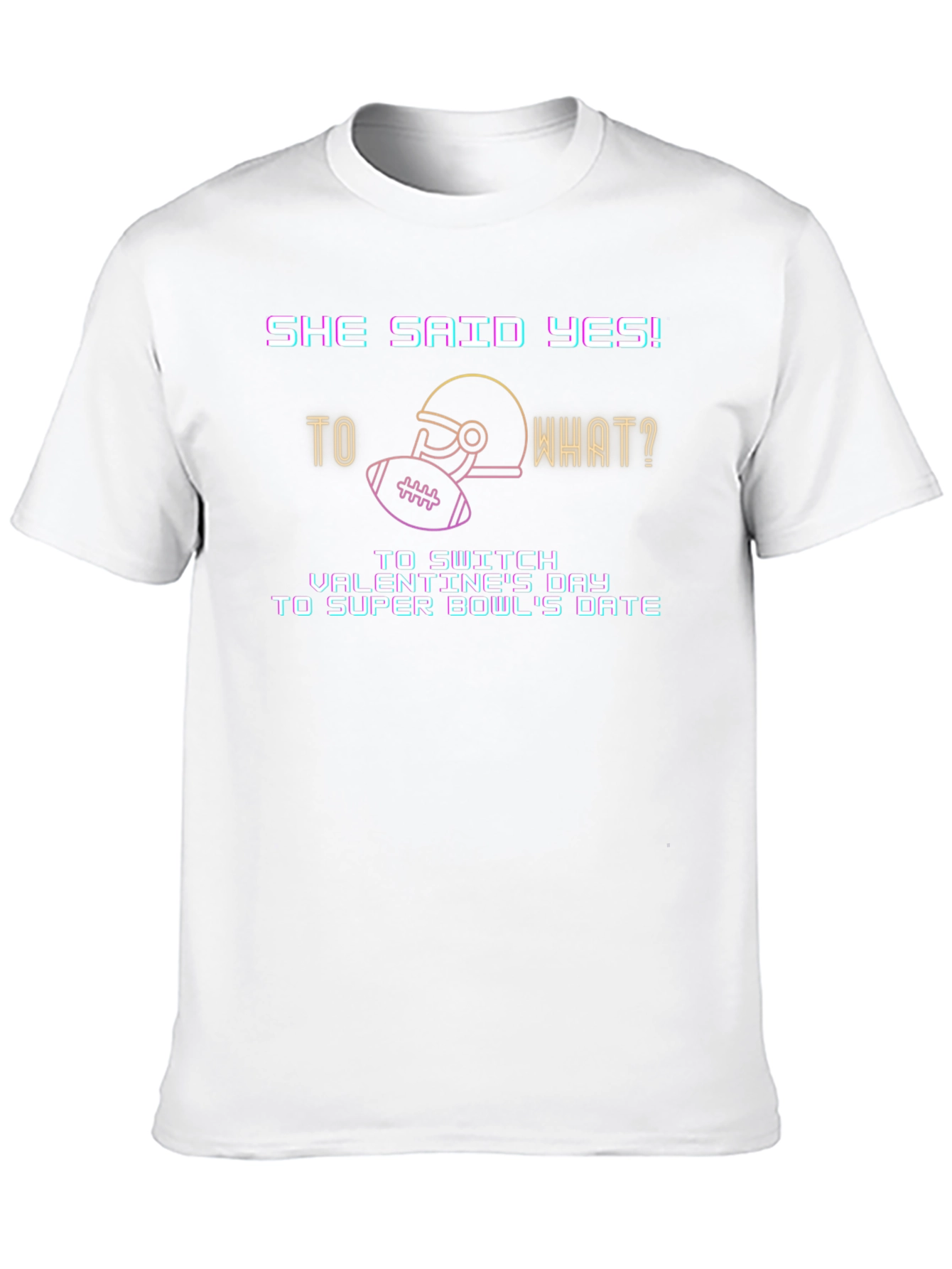 Celebrate a quirky Valentine's Day proposal with this unique black t-shirt. The design features a humorous message: "She Said Yes! to what? To switch Valentine's Day to Super Bowl's Date." A football helmet and ball graphic adds to the fun, sporty vibe. Made from comfortable, breathable fabric, this tee is perfect for casual wear, game day, or as a fun gift for football-loving couples. Show off your playful side and love for the game with this eye-catching t-shirt.