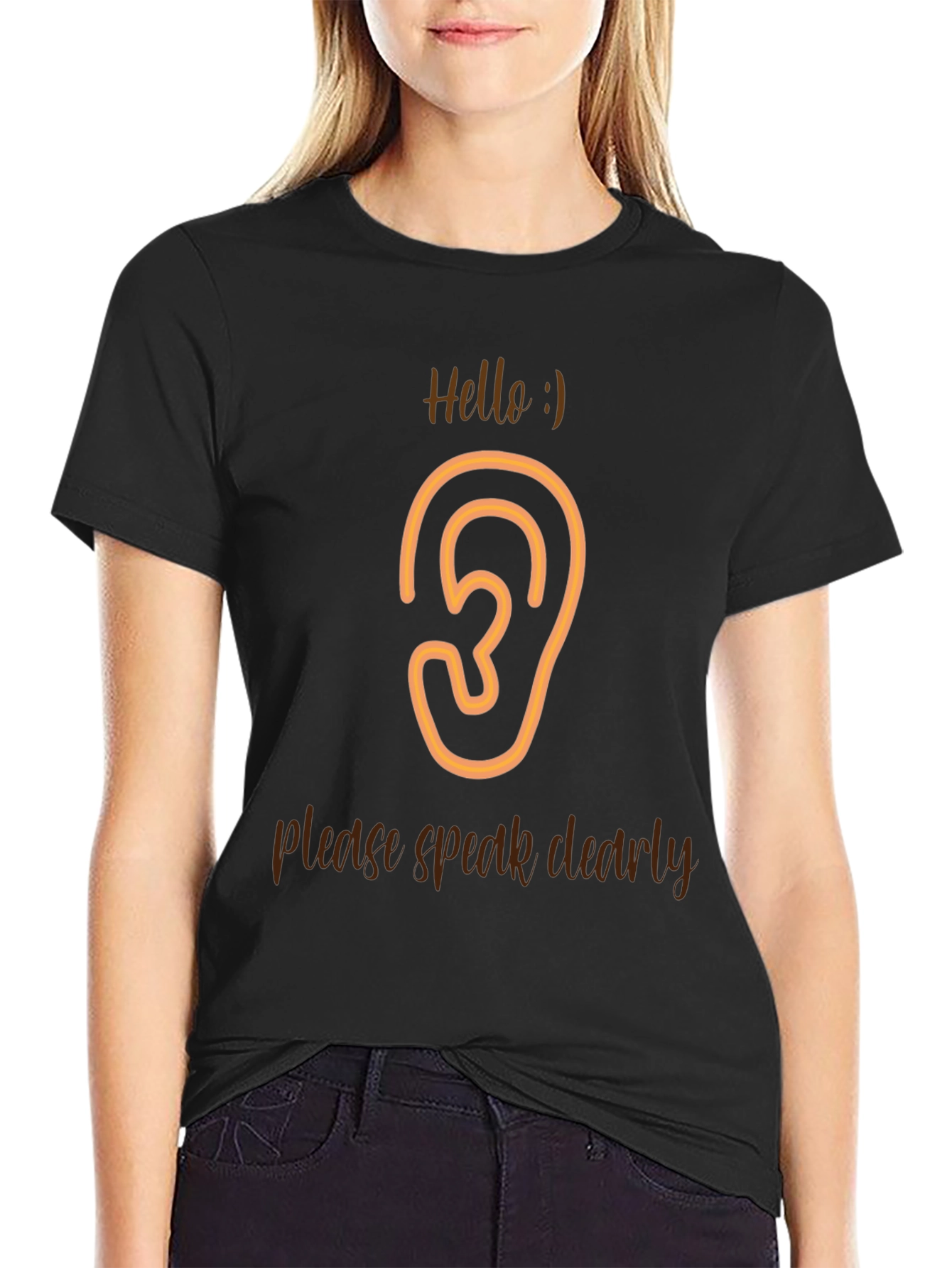 This unique black t-shirt features a quirky design with a large ear graphic and the humorous phrase "please speak clearly". The soft cotton material ensures all-day comfort, while the relaxed fit provides a casual yet stylish look. Perfect for those who appreciate a touch of wit in their wardrobe or anyone with a playful sense of humor. Wear it to social gatherings, casual outings, or as a conversation starter wherever you go! The crisp graphic ensures you'll be heard (or seen!) loud and clear. Its dark color makes it versatile with jeans, shorts, or even dressed up under a jacket. A must-have addition to any fun-loving individual's collection.