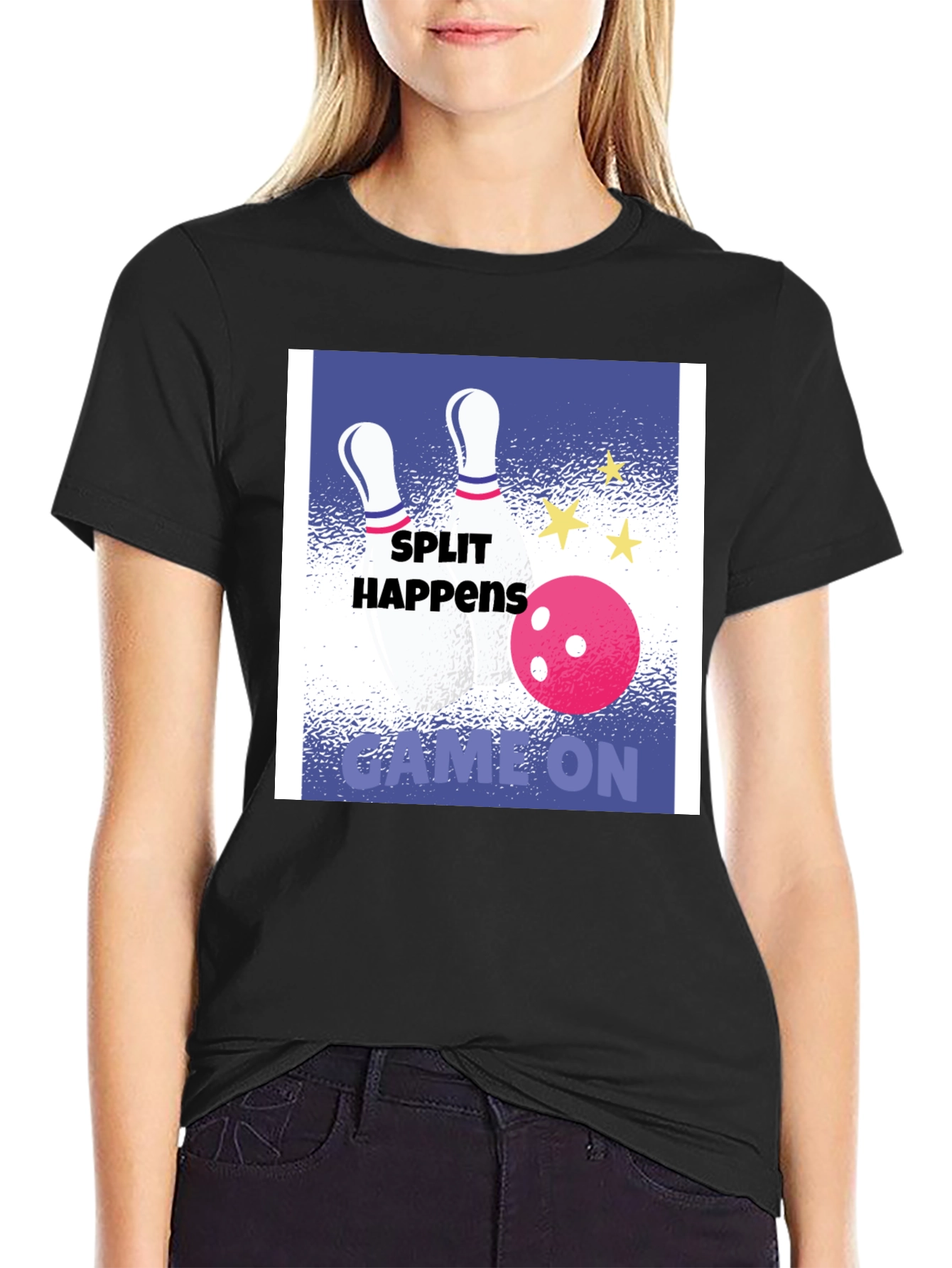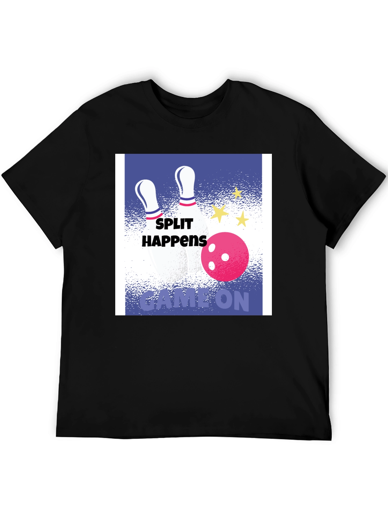 Strike up some fun with this stylish graphic tee! This black t-shirt features a vibrant graphic design with bowling pins, a bowling ball, and the text "Split Happens Game On". The design is set against a blue and white backdrop. Made from a soft, breathable fabric, this tee offers all-day comfort and is perfect for casual wear. Whether you're hitting the bowling alley, hanging out with friends, or just relaxing at home, this t-shirt is sure to be a conversation starter. Show off your love for bowling with this unique and eye-catching design.