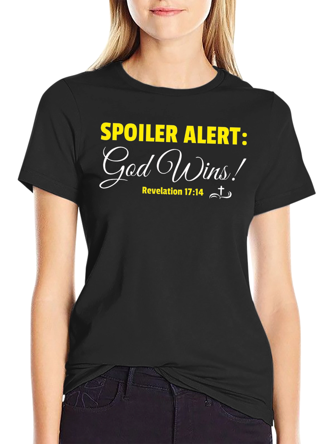 Declare your faith with this bold black t-shirt featuring the powerful message "Spoiler Alert: God Wins!" in eye-catching yellow and white lettering. Underneath, "Revelation 17:14" is elegantly displayed, complete with a symbolic cross, reminding you of hope and ultimate victory. Made from a comfortable-looking material, this casual tee is perfect for expressing your beliefs in everyday life. Wear it to church, casual gatherings, or as a statement piece to spark meaningful conversations. Share your faith, spread positivity, and let the world know who wins!