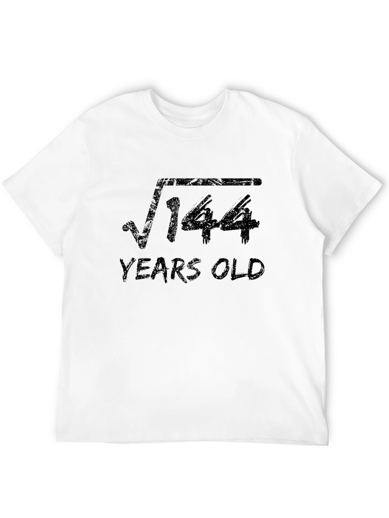 Show off your love for math and humor with this unique t-shirt. Featuring a bold square root of 144 design above the words 'YEARS OLD', this shirt is sure to turn heads and spark conversations. The design is printed in a vintage style that gives it a worn-in and casual feel. Made from soft, breathable fabric, it offers all-day comfort. Perfect for birthdays, math enthusiasts, or anyone with a playful sense of humor, this tee combines comfort, style, and intellectual flair. Make a statement and celebrate another year with this eye-catching design.