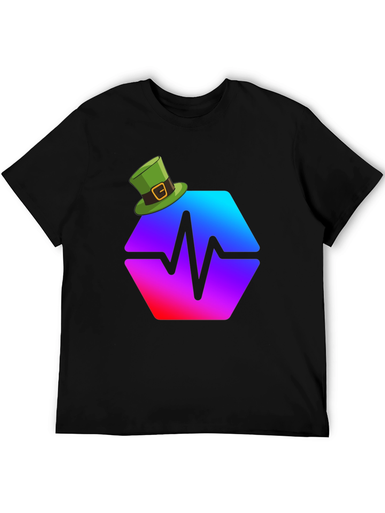 Celebrate St. Patrick's Day with this unique black t-shirt! The shirt features a bold, gradient hexagon graphic emblazoned across the chest, showcasing an eye-catching blue to red to purple transition, with a central pulse design. Topping the design is a festive green leprechaun hat with a gold buckle, adding a touch of Irish charm. Made from comfortable, breathable fabric, this tee is perfect for St. Patrick's Day parties, casual outings, or any day you want to add a bit of luck to your style. Stand out from the crowd with this limited-edition, festive design!