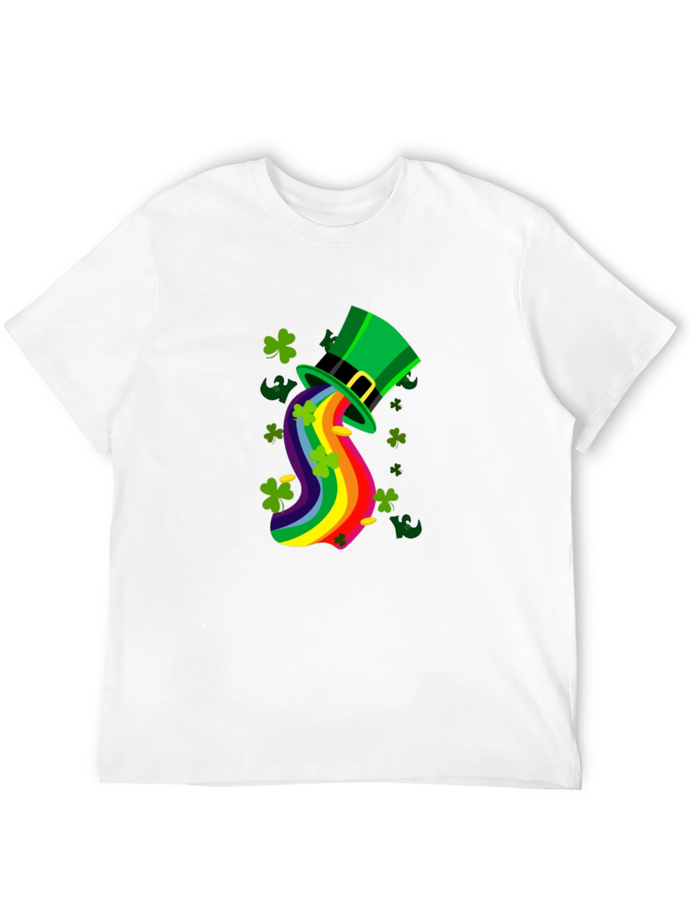 Celebrate St. Patrick's Day in style with this unique t-shirt! The shirt features a vibrant design of a green leprechaun hat spilling a rainbow of colors, surrounded by lucky four-leaf clovers. Made from a comfortable, breathable fabric, this tee is perfect for parties, parades, or casual wear. Its eye-catching graphics are sure to spread the luck of the Irish wherever you go. Show off your festive spirit with this fun and festive t-shirt. Get ready to turn heads and bring a touch of magic to your St. Patrick's Day festivities!