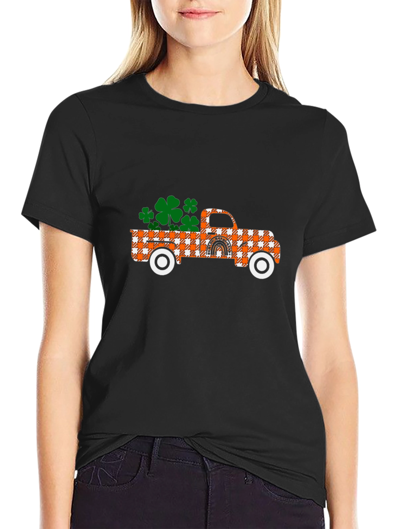 Show off your festive side with this St. Patrick's Day themed t-shirt! This black tee features a charming graphic of a vintage truck filled with vibrant green shamrocks. The truck itself is designed with a trendy checkered pattern, adding a touch of rustic flair. A small rainbow design adds to the charm. Made from a soft, breathable fabric, this shirt is perfect for all-day comfort while celebrating St. Patrick's Day, or any day you want to spread a little luck and cheer. Pair it with your favorite jeans or leggings for a casual, festive look!