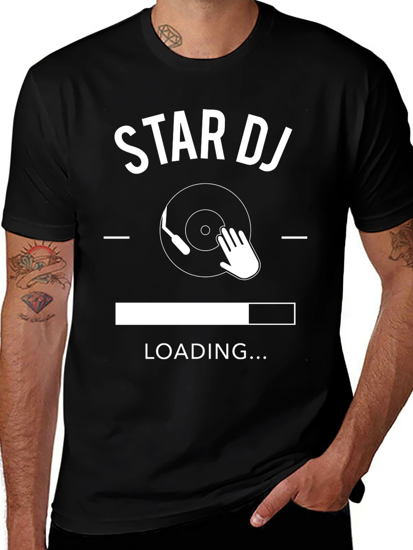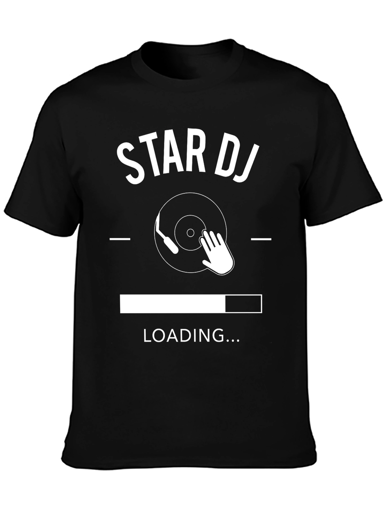 Rock the party with this stylish black Star DJ T-shirt. Made from comfortable, breathable fabric, this tee features a unique design of a record player and loading bar graphic. Ideal for DJs, music lovers, or anyone who wants to show off their passion for music. Whether you're spinning tunes at a club, hanging out with friends, or just want a standout casual outfit, this t-shirt combines comfort with a cool, musical edge. Get yours today and let everyone know you're ready to drop the beat!