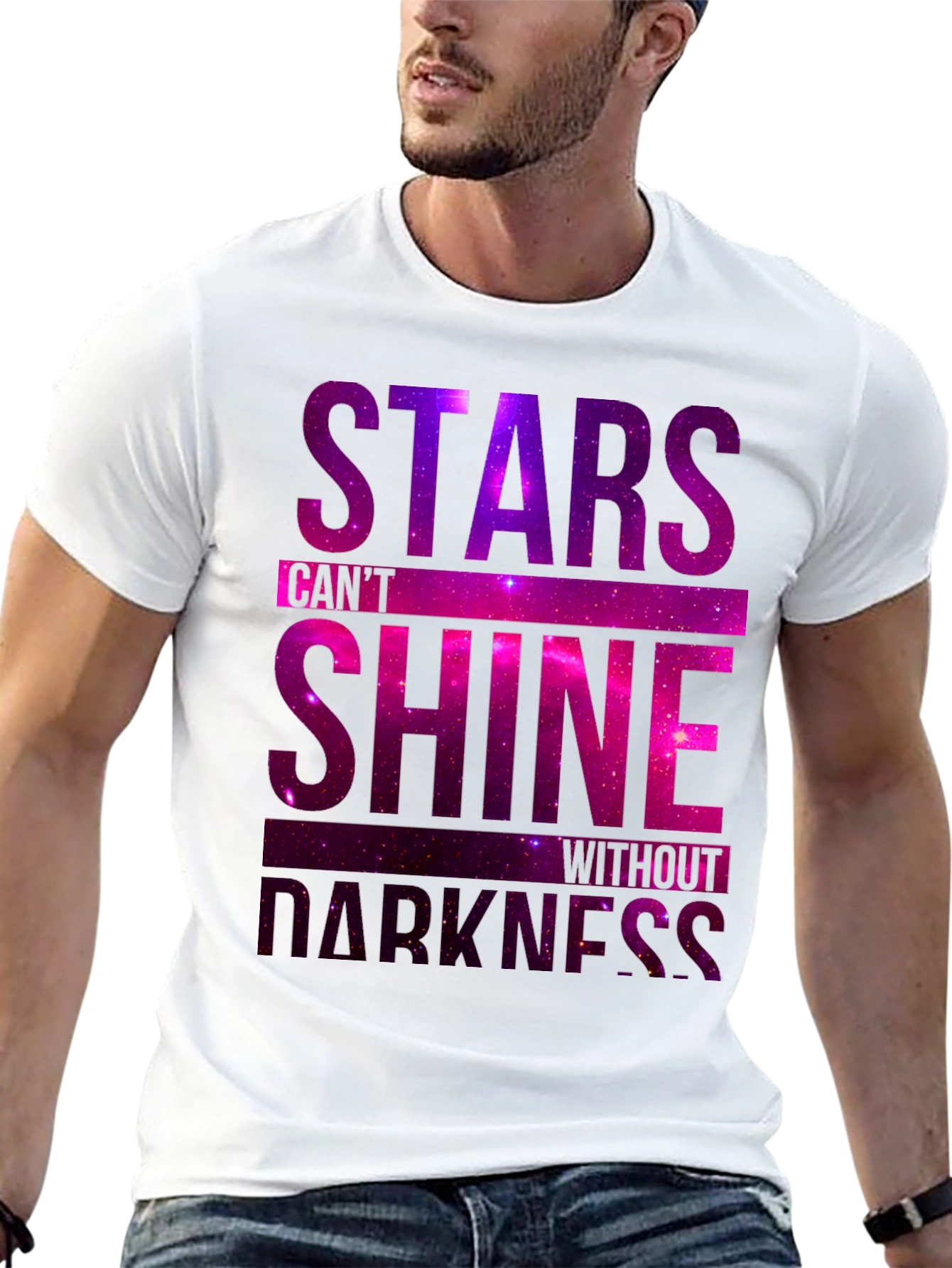 Showcase your cosmic style with this black t-shirt featuring a vibrant galaxy-inspired design. The shirt boldly states 'Stars Can't Shine Without Darkness,' using a stunning purple and pink galaxy print. The comfortable fit and soft fabric make it ideal for everyday wear, while the motivational message adds a touch of inspiration to your wardrobe. Perfect for casual outings, gym sessions, or as a unique gift for astronomy lovers. Stand out and spark conversations with this eye-catching tee!