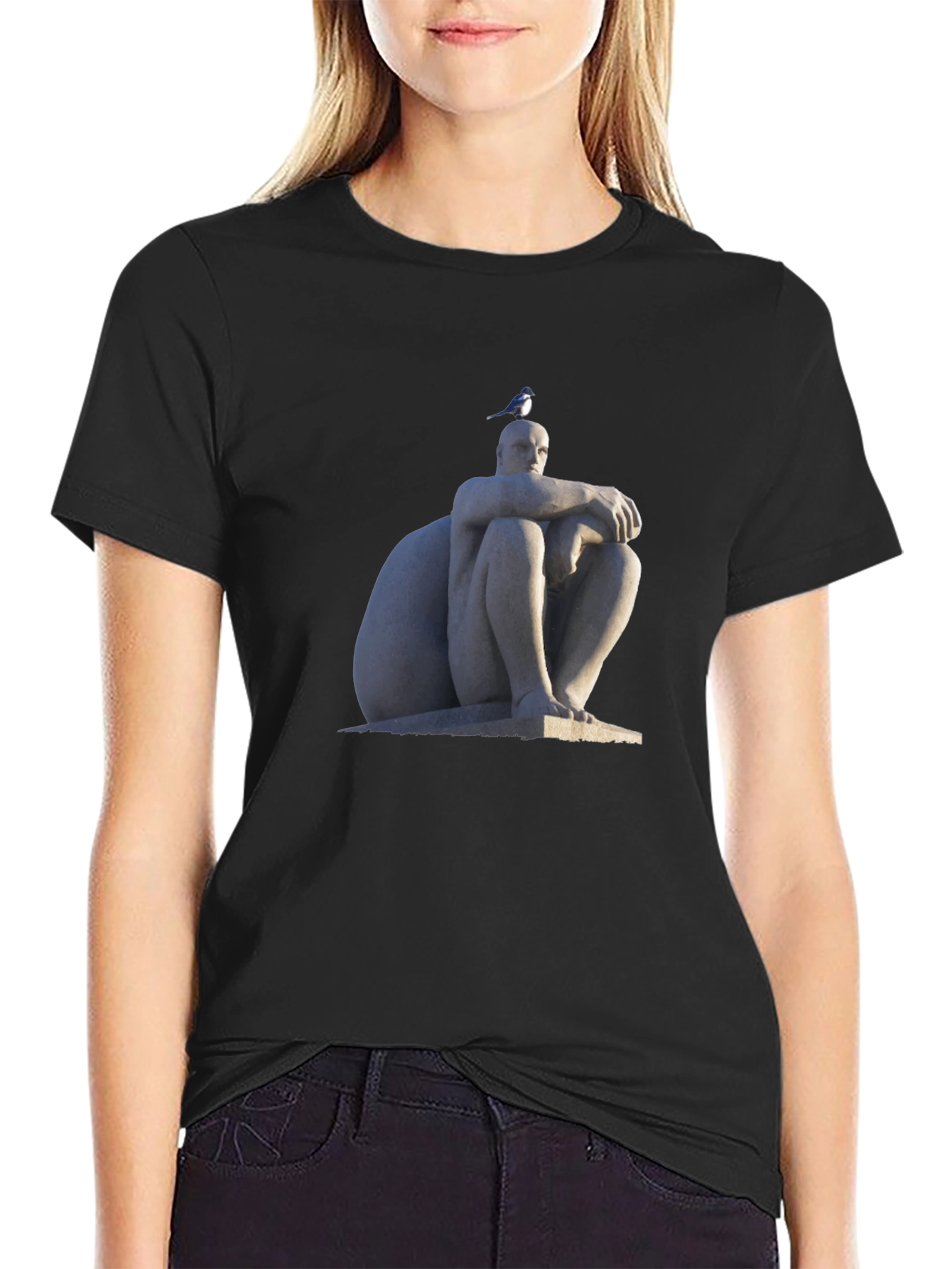 This black t-shirt features a unique print of a seated statue with a bird perched on its head. The design gives off an artistic and thoughtful vibe. Made from a soft-looking fabric, this shirt is designed for comfort as well as style. Its neutral color makes it easy to pair with jeans, shorts, or even layered under a jacket. Perfect for casual outings, art enthusiasts, or anyone looking to add a touch of sophistication to their wardrobe. This tee offers a comfortable fit while showcasing an eye-catching graphic.