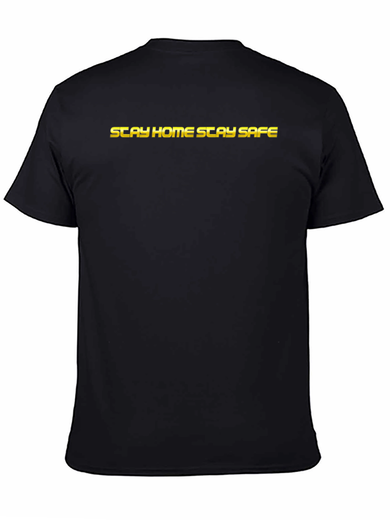 This black t-shirt features bold, yellow lettering that reads "STAY HOME STAY SAFE." The classic crew neck design and short sleeves make it a comfortable choice for everyday wear. The shirt appears to be made from a soft, breathable fabric, perfect for lounging at home or casual outings. The strong message promotes safety and responsibility in a stylish way. Ideal for anyone who wants to express their commitment to staying safe and healthy. This tee is a great addition to a casual wardrobe, providing both comfort and a meaningful message.