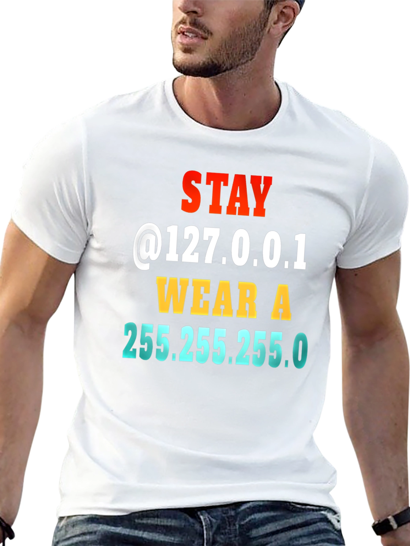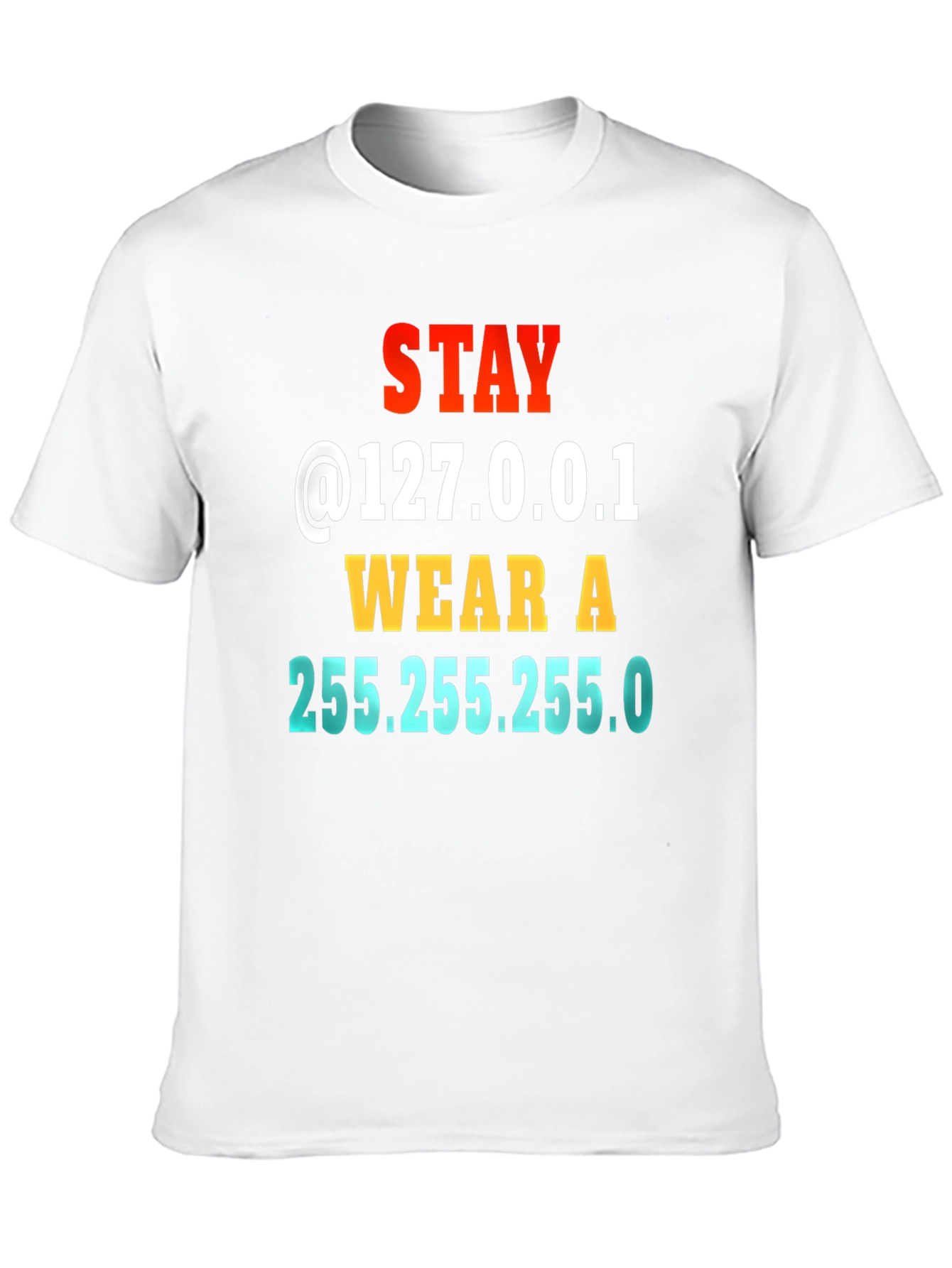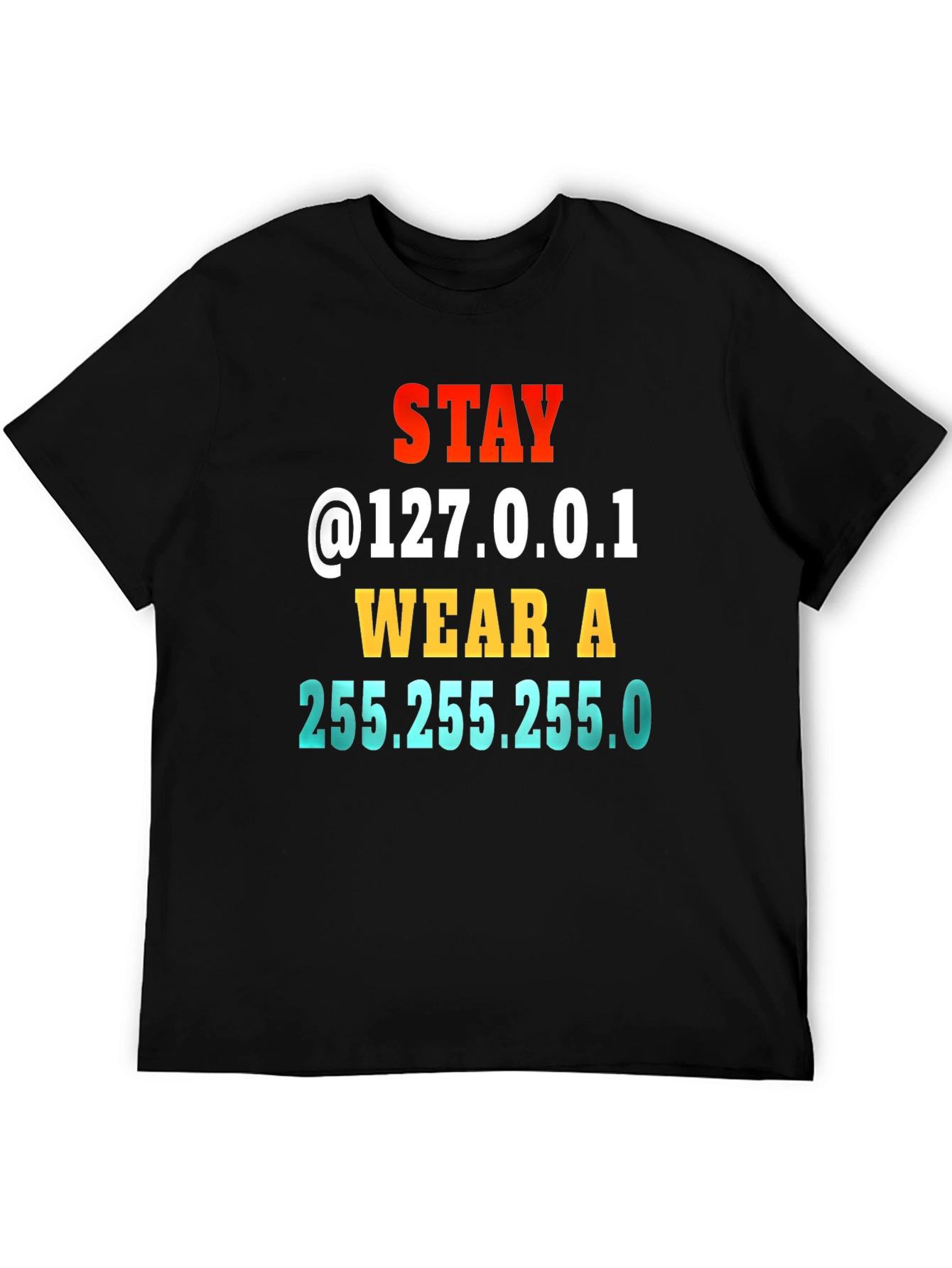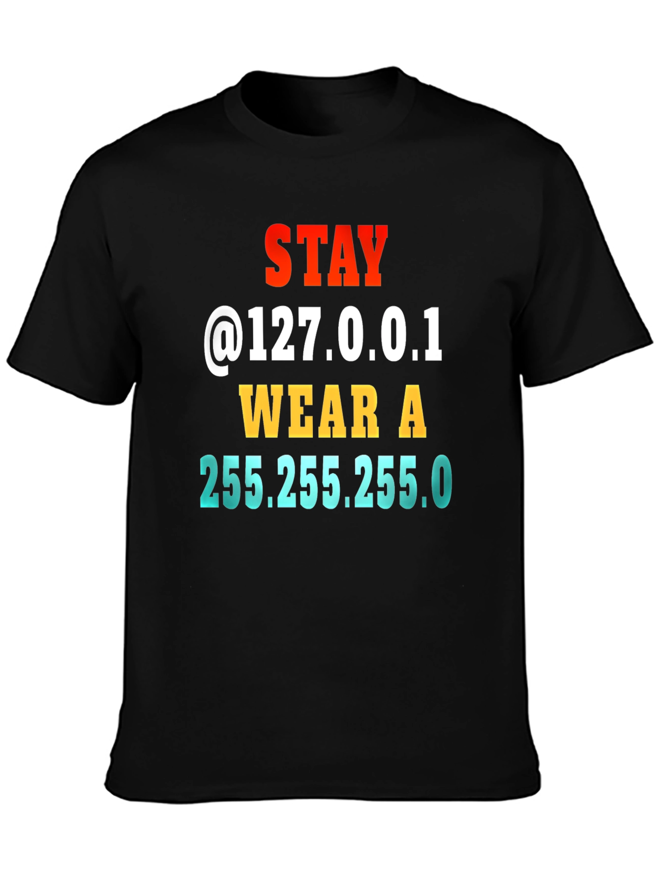 Show off your witty side with this humorous t-shirt. It features 'Stay @127.0.0.1 WEAR A 255.255.255.0', making it a clever joke for IT professionals, nerds, or anyone who appreciates a good pun. The eye-catching typography uses vibrant colors (red, yellow, and blue) for the text. Made from comfortable black fabric. A fun piece of clothing that adds a touch of personality to any casual outfit. Great for wearing at home, tech conferences, or coding meetups.