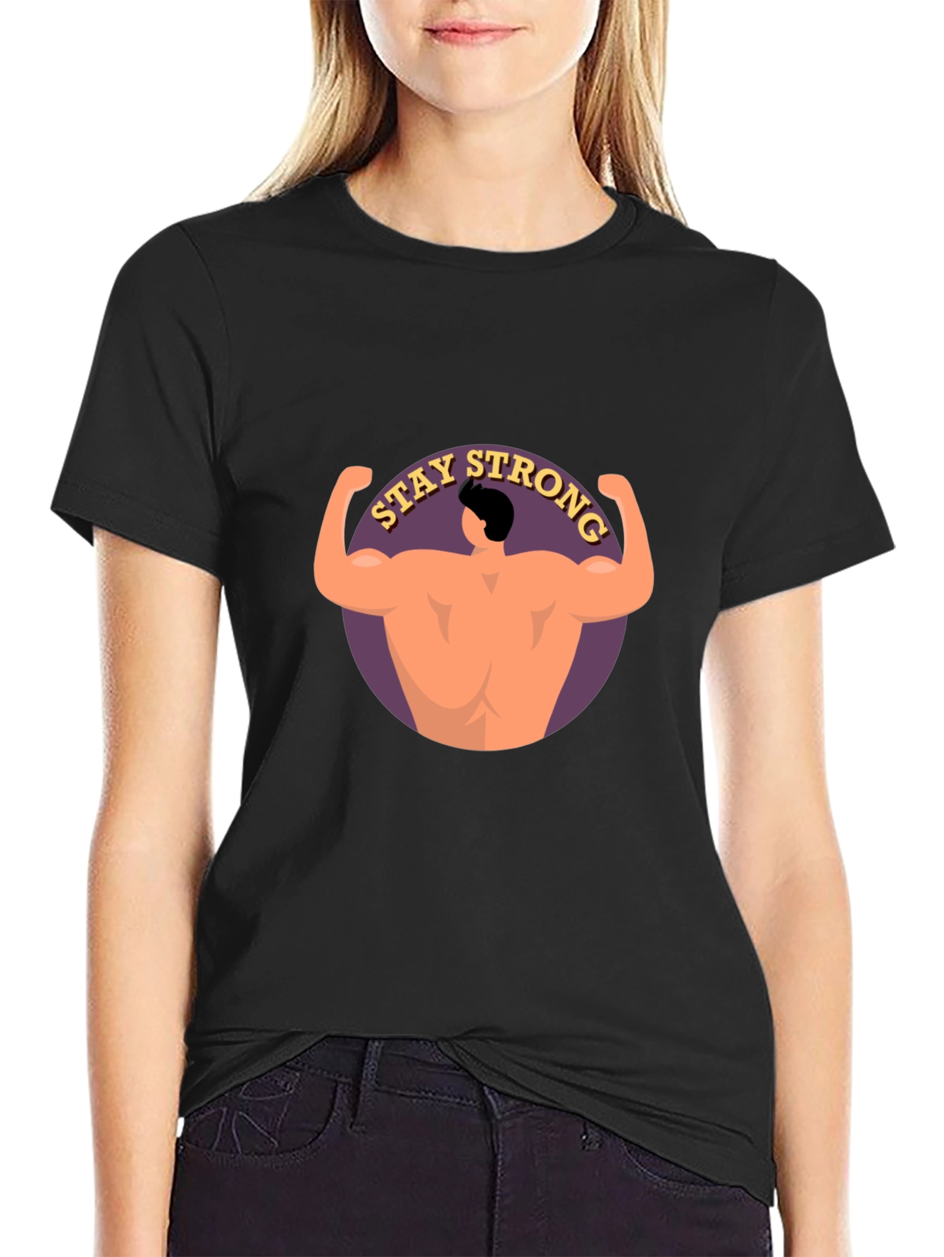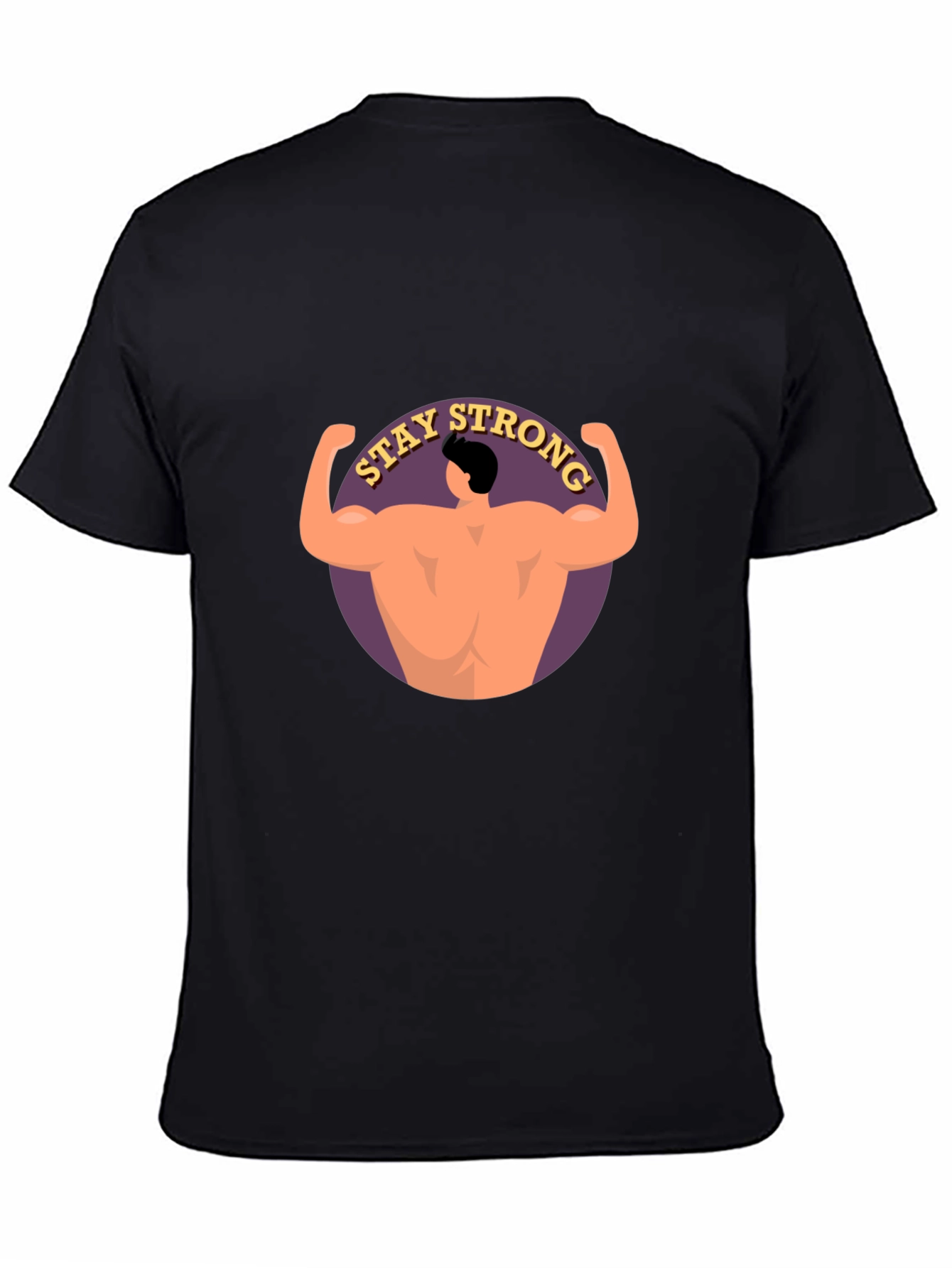 Show your strength with this stylish black t-shirt. The shirt features a unique graphic print of a muscular back with the words 'Stay Strong' in a semicircular design. This t-shirt offers a comfortable fit and versatile style. Crafted from soft, breathable fabric, it ensures all-day comfort. Perfect for casual wear, workouts, or making a statement, this t-shirt combines fitness inspiration with everyday fashion. Get yours today and showcase your commitment to strength and well-being!