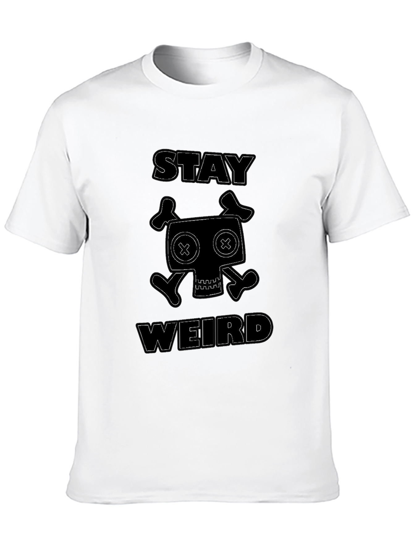 Embrace your individuality with this eye-catching black t-shirt. Featuring a unique graphic design of a quirky skull and crossbones with the words "STAY WEIRD" above and below, this tee is perfect for those who love to stand out. The design is printed in a light color and stands out on the black background. Made from a soft, comfortable fabric, this shirt is ideal for everyday wear. Show off your unique style and let the world know you're not afraid to be different with this must-have t-shirt. Perfect for casual outings, concerts, or just lounging around, this shirt is a statement piece that speaks volumes.