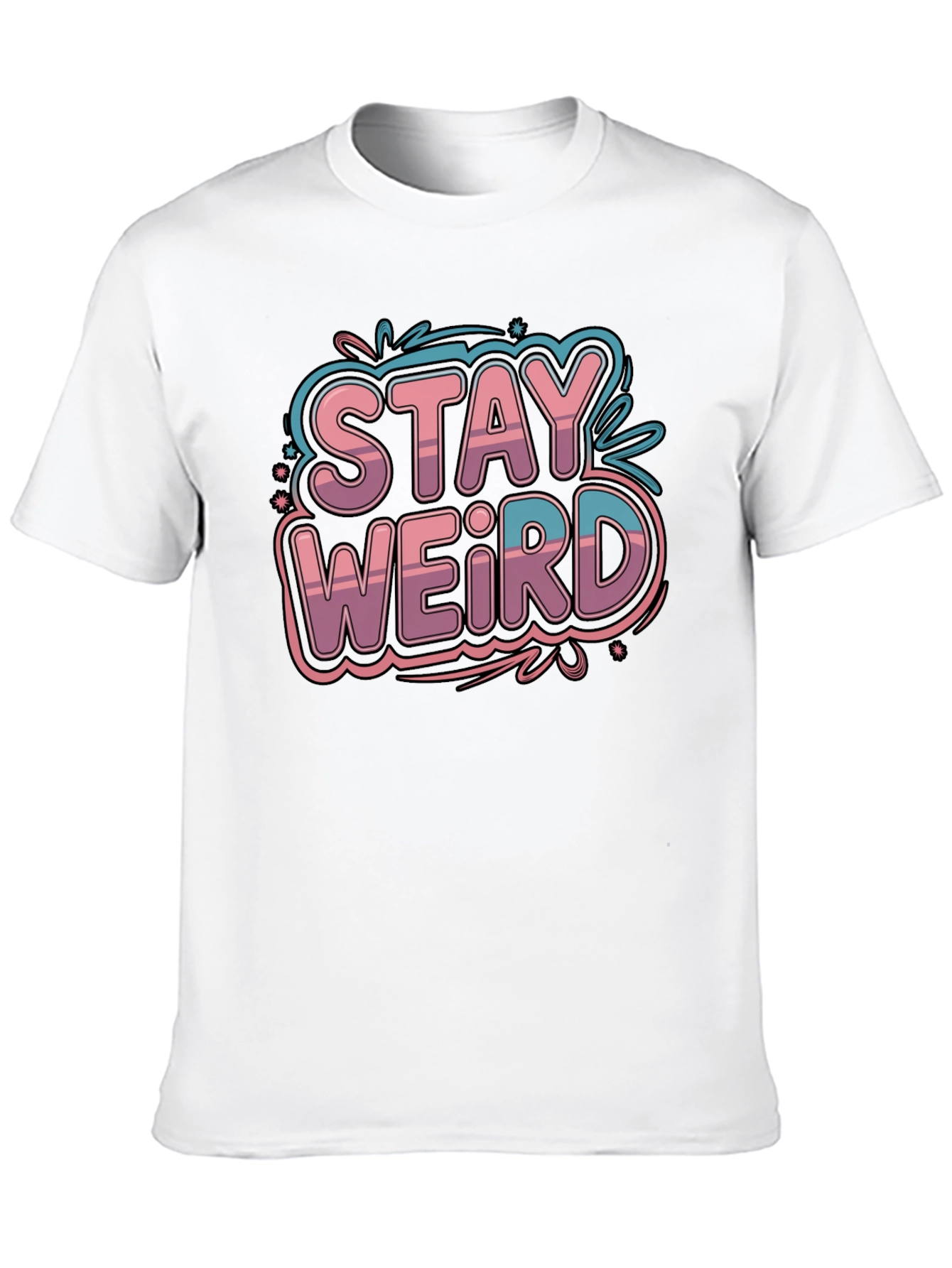 Express your unique style with this eye-catching 'Stay Weird' graphic t-shirt. Crafted from a comfortable black cotton blend, this tee features a playful, colorful design with a retro vibe. The bold lettering stands out, making a statement wherever you go. Perfect for casual outings, concerts, or just lounging around, this tee is a must-have for those who embrace their individuality. It's soft, breathable, and designed for all-day wear. Stand out from the crowd and let your inner weirdo shine! A perfect gift for anyone who loves unique and expressive clothing.