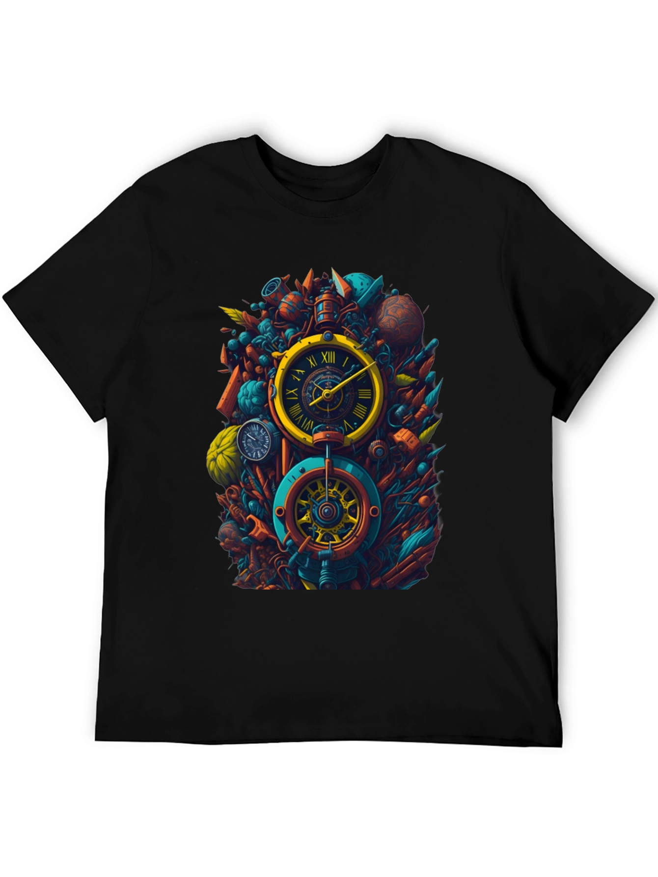 Show off your unique style with this eye-catching black t-shirt featuring a vibrant steampunk-inspired clockwork design. The intricate graphic showcases a blend of gears, dials, and clock faces in a dazzling array of colors, from golden yellows and deep oranges to teal and turquoise accents. Made from comfortable materials, this shirt is perfect for casual wear, conventions, or expressing your love for alternative aesthetics. Stand out from the crowd and make a statement with this one-of-a-kind t-shirt, perfect for any steampunk enthusiast or anyone looking to add a touch of creative flair to their wardrobe.