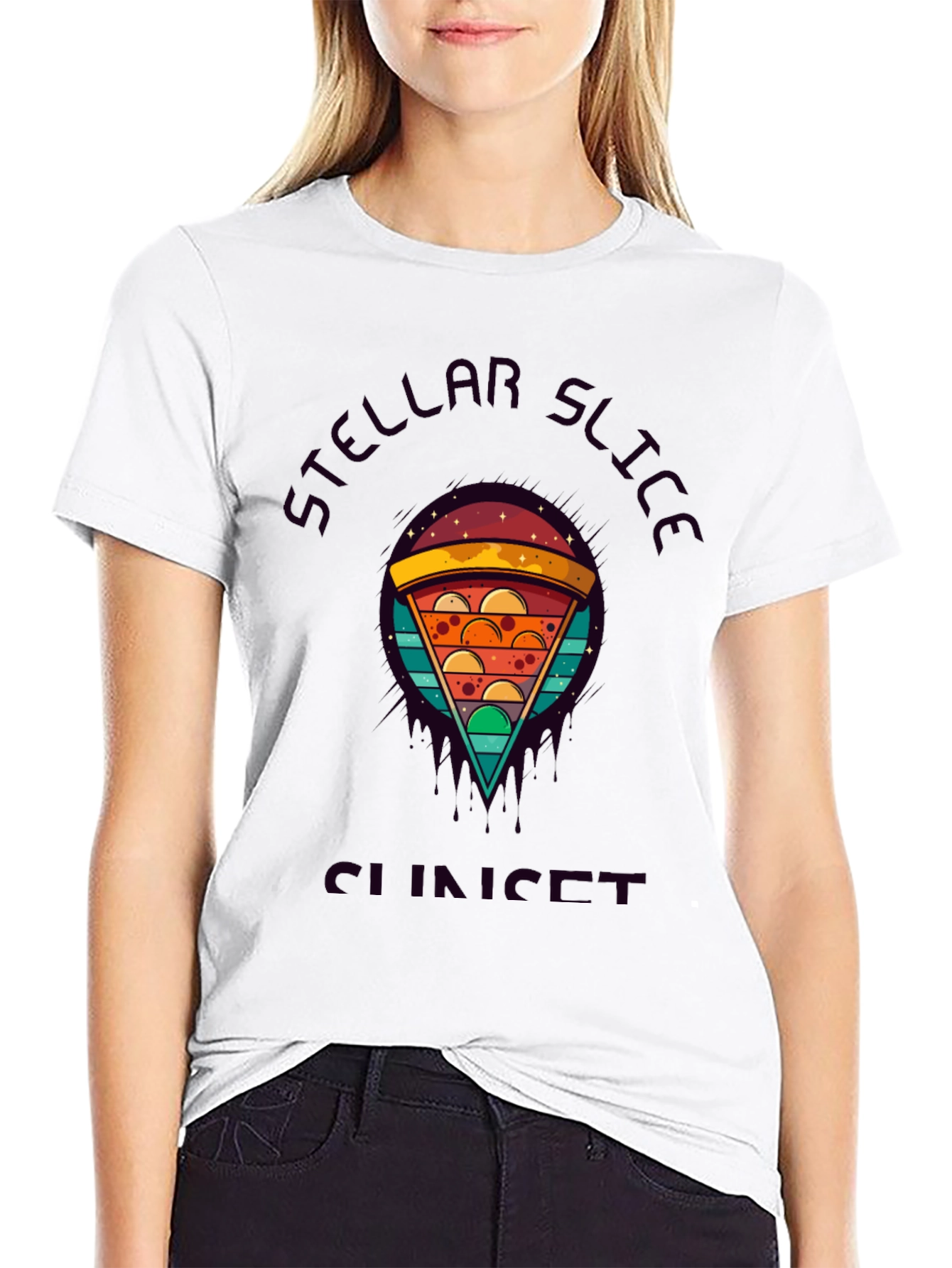 Elevate your casual wardrobe with this unique graphic tee! This eye-catching black t-shirt features a vibrant and artistic design of a pizza slice representing a stellar sunset. The 'Stellar Slice Sunset' graphic is a cool and quirky image. Made from a soft, breathable fabric, this shirt is perfect for everyday wear. The classic crew neck and short sleeves offer a comfortable fit for any occasion. Stand out from the crowd with this stylish and conversation-starting tee! Ideal for pizza lovers and anyone who appreciates unique graphic art.
