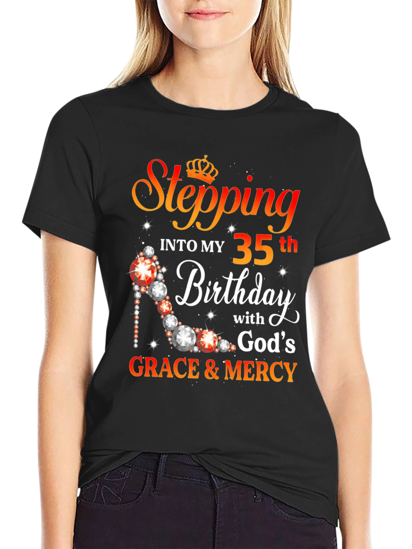 Celebrate a milestone with this stylish black t-shirt. Featuring a vibrant "Stepping into my 35th Birthday with God's Grace & Mercy" graphic, complete with a crown and jeweled high heel design, this tee adds a touch of sparkle to your special day. Perfect for birthday parties, casual outings, or as a memorable gift. This comfortable tee is made from soft, breathable material. Make your 35th unforgettable with this unique and eye-catching t-shirt.