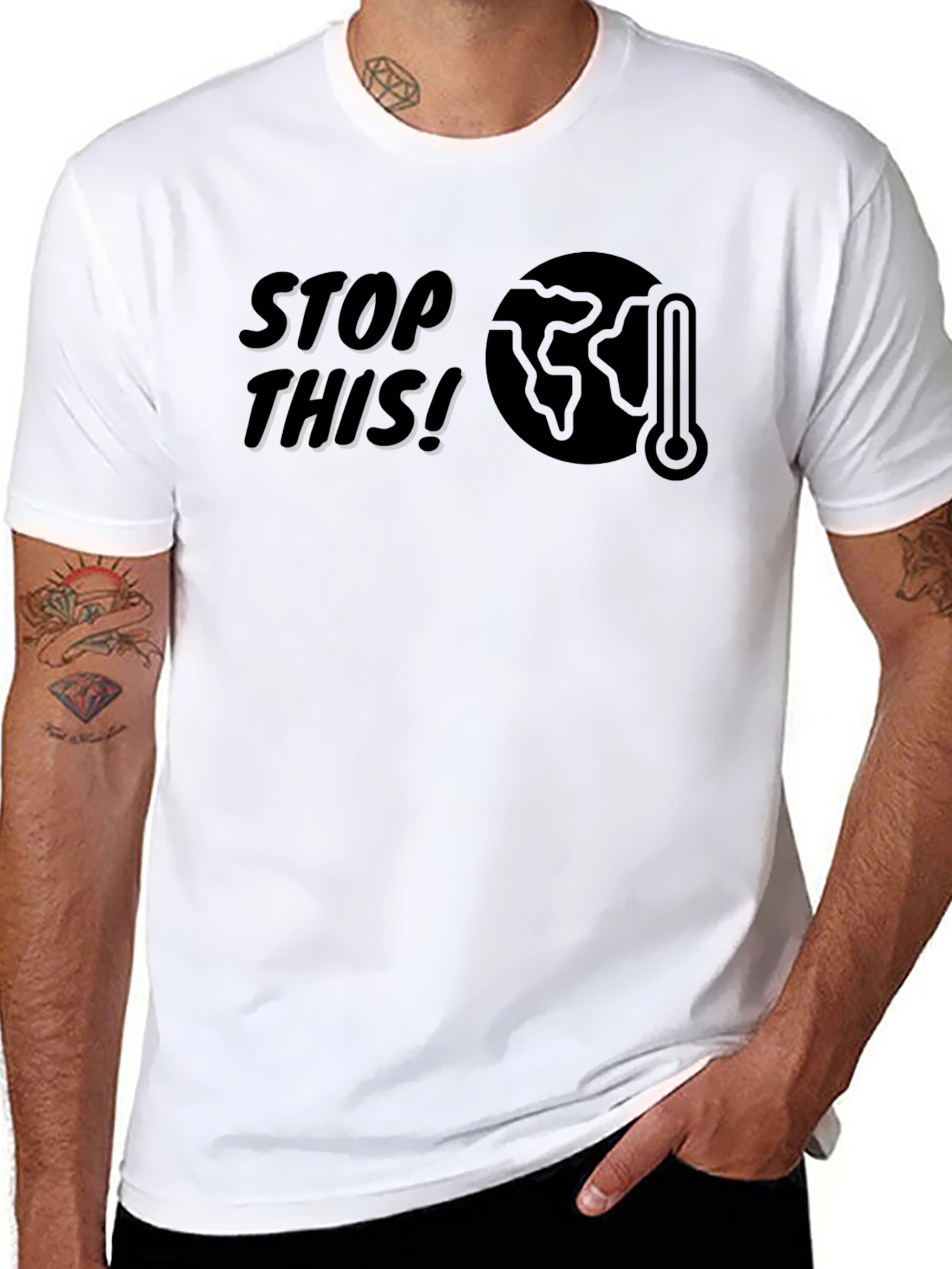 Make a statement with this bold, black t-shirt. Featuring a powerful message against global warming, the shirt displays the text "Stop This!" alongside a graphic of the earth with a thermometer, emphasizing the urgency of the climate crisis. Made from a soft, comfortable fabric, this tee is perfect for everyday wear and shows your support for environmental awareness. The classic fit makes it a versatile addition to any wardrobe. Wear it to protests, rallies, or simply as a daily reminder to make eco-conscious choices. This t-shirt is a great conversation starter and shows that you care about our planet. Available in various sizes.
