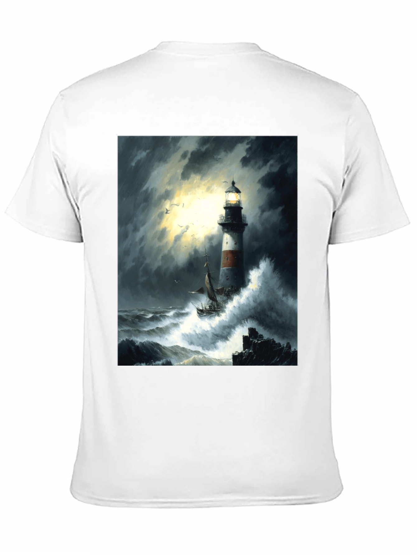 Brave the elements in style with this striking graphic tee! The shirt features a vivid image of a lighthouse standing tall against a tumultuous sea, complete with crashing waves and dramatic storm clouds. The detailed artwork also showcases a small ship navigating the rough waters. Made from a comfortable, breathable material, this tee is perfect for everyday wear. Show off your adventurous spirit or your love for nautical themes with this unique and eye-catching t-shirt. It's ideal for casual outings, or as a statement piece. A great gift for anyone who loves the sea!