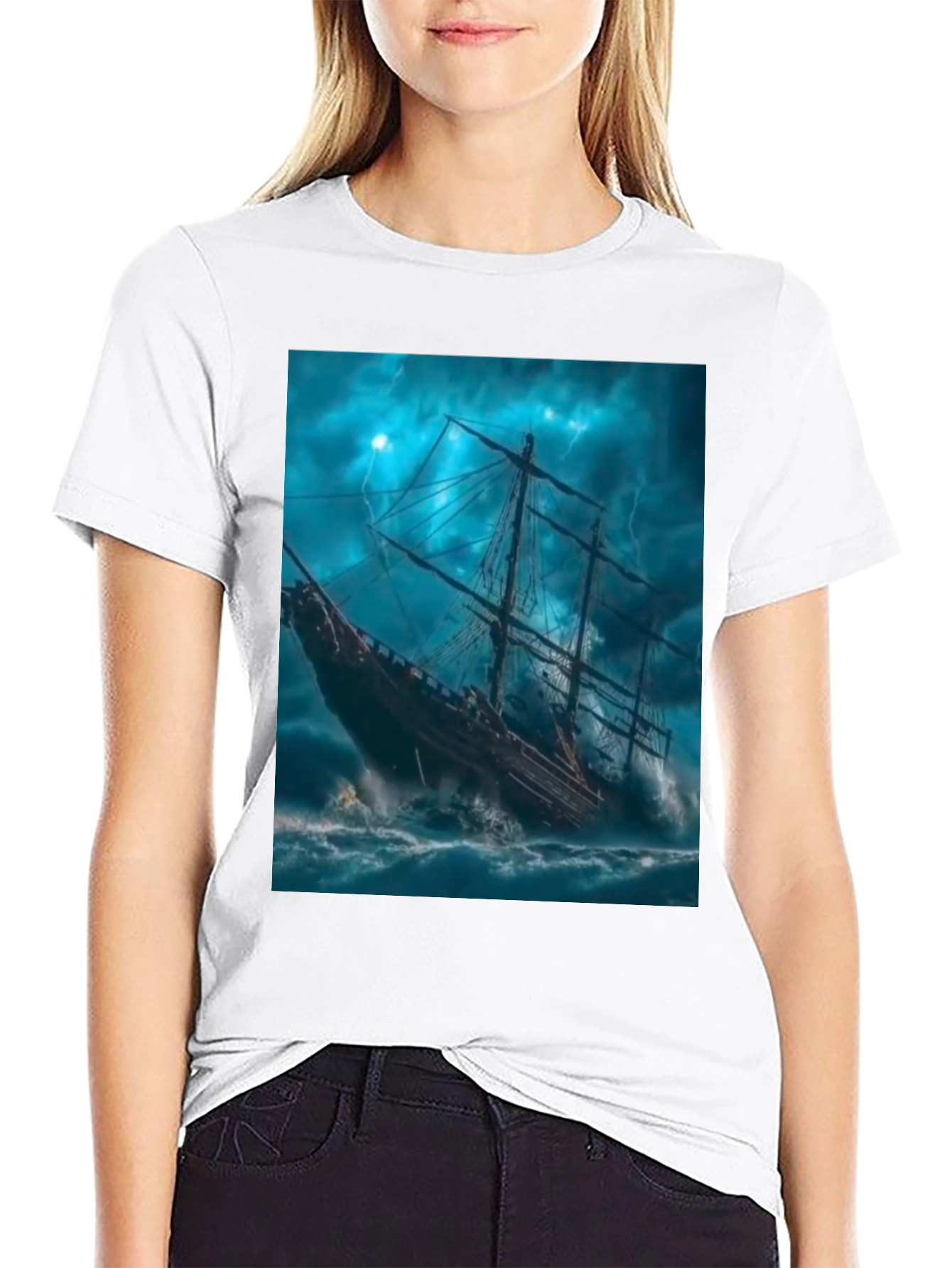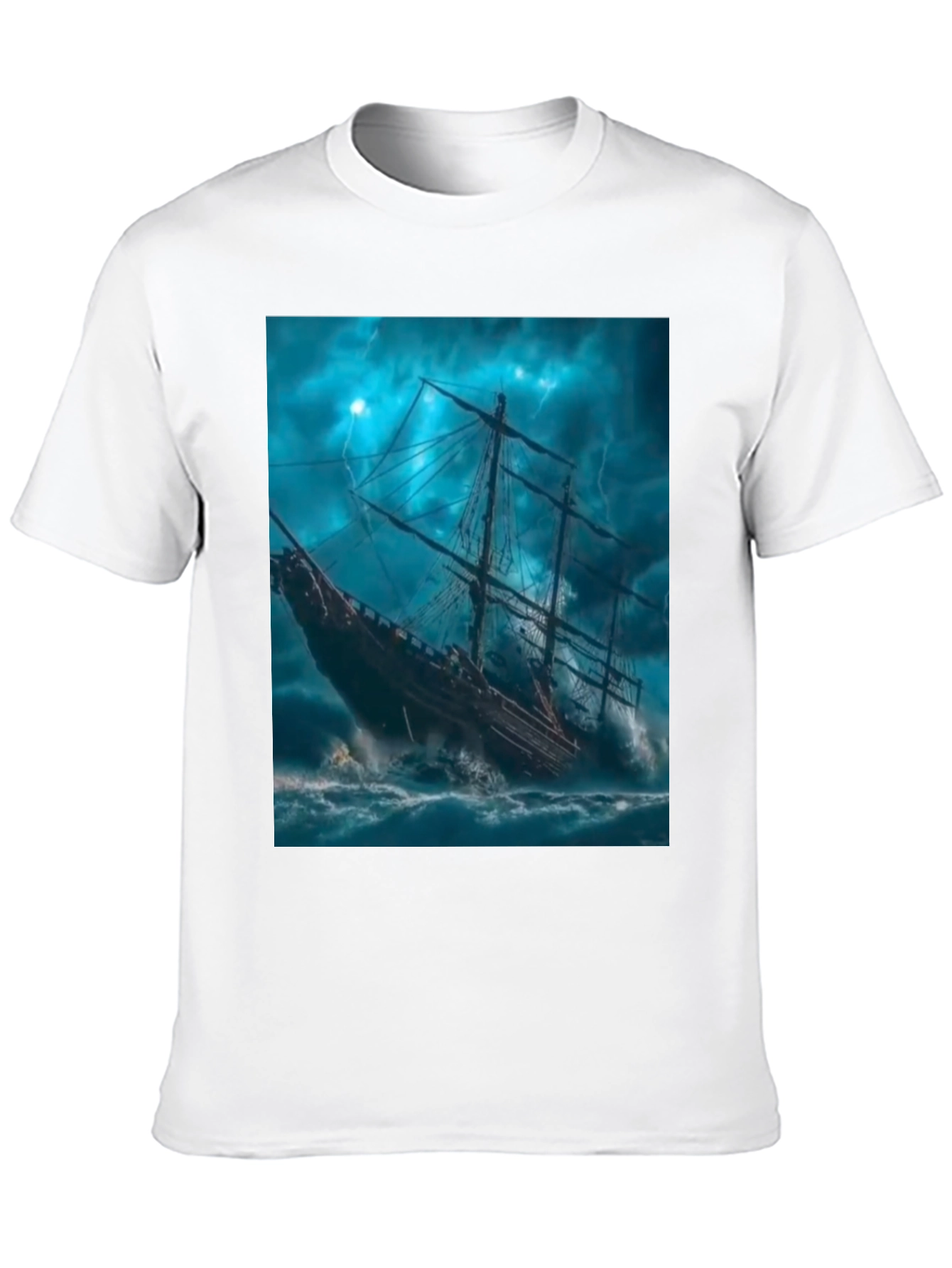 Embrace the power of the ocean with this striking black t-shirt featuring a dramatic graphic. A detailed image of an old sailing ship battling a stormy sea, complete with crashing waves and a turbulent sky, is prominently displayed. The print is eye-catching and full of detail. Made from a soft, comfortable fabric blend, this tee offers both style and wearability. Perfect for casual outings, expressing your adventurous spirit, or as a standout piece in your wardrobe, this unique tee is sure to make a statement.