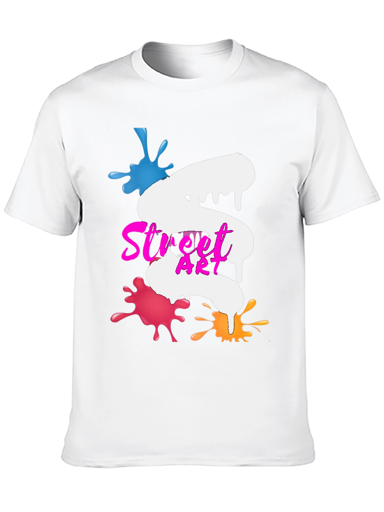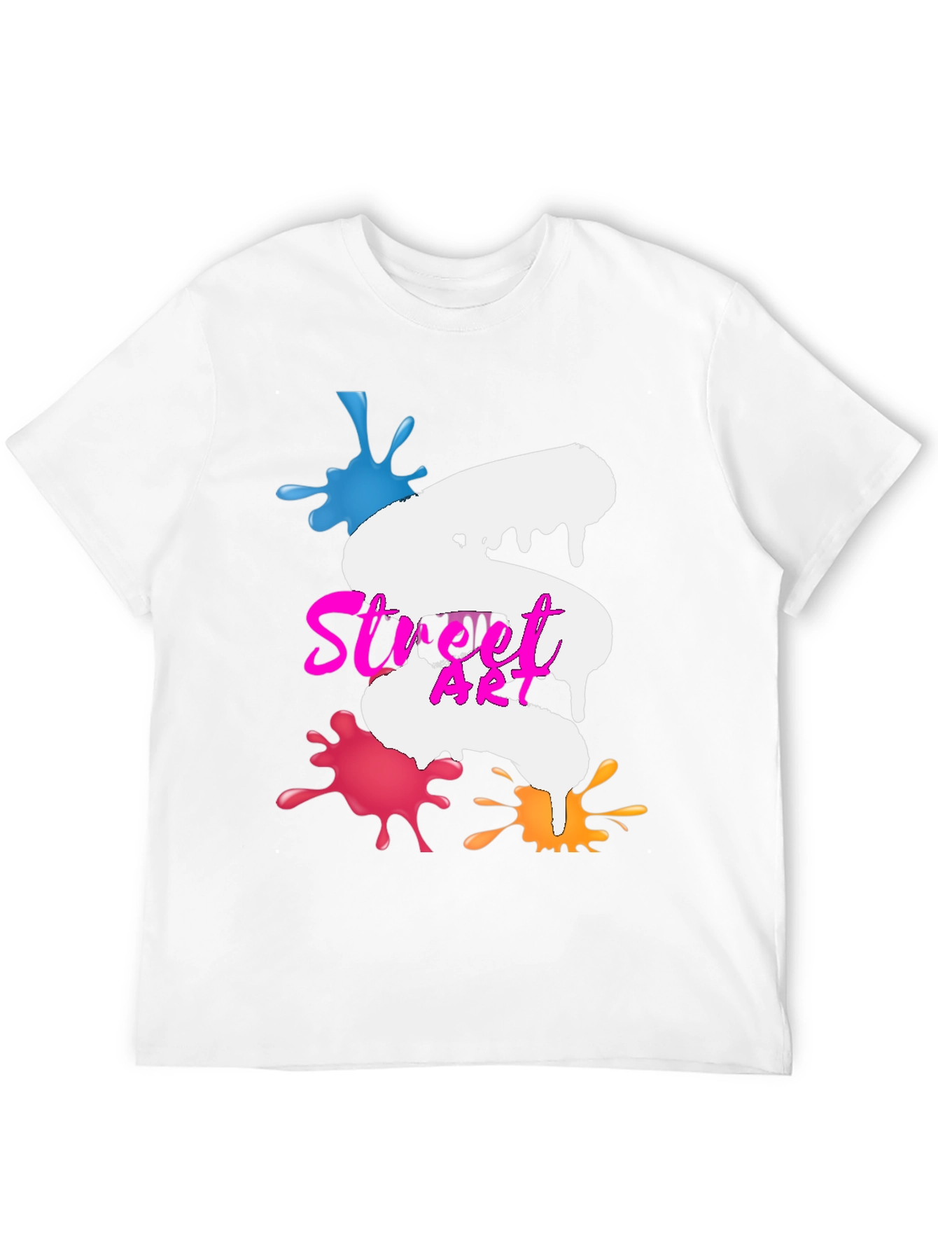 Make a bold statement with this eye-catching black t-shirt featuring a vibrant "Street Art" graphic. The design includes a stylized white shape adorned with colorful paint splashes in blue, pink, red, and orange, adding a unique artistic touch. Crafted from a comfortable and durable fabric, this tee is perfect for casual wear, art enthusiasts, and anyone looking to express their individuality. The striking graphic ensures you'll stand out from the crowd while staying comfortable all day long. Pair it with jeans, shorts, or joggers for a stylish and effortlessly cool look. Express yourself with this wearable art piece!