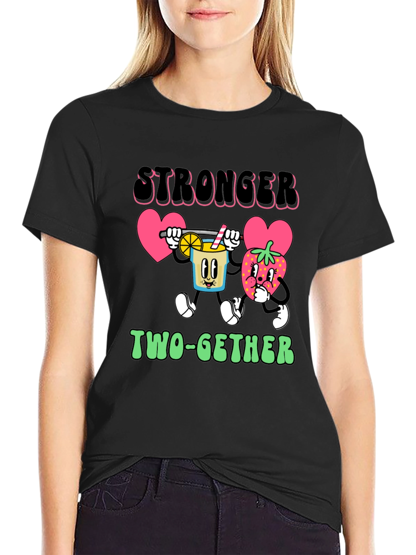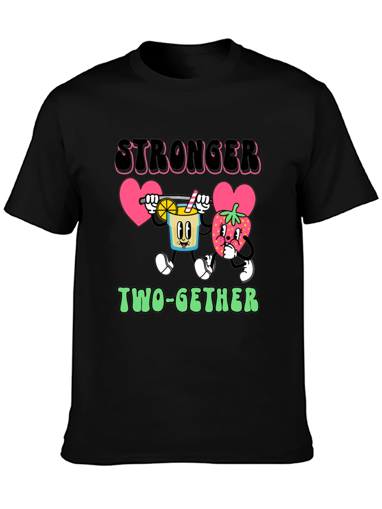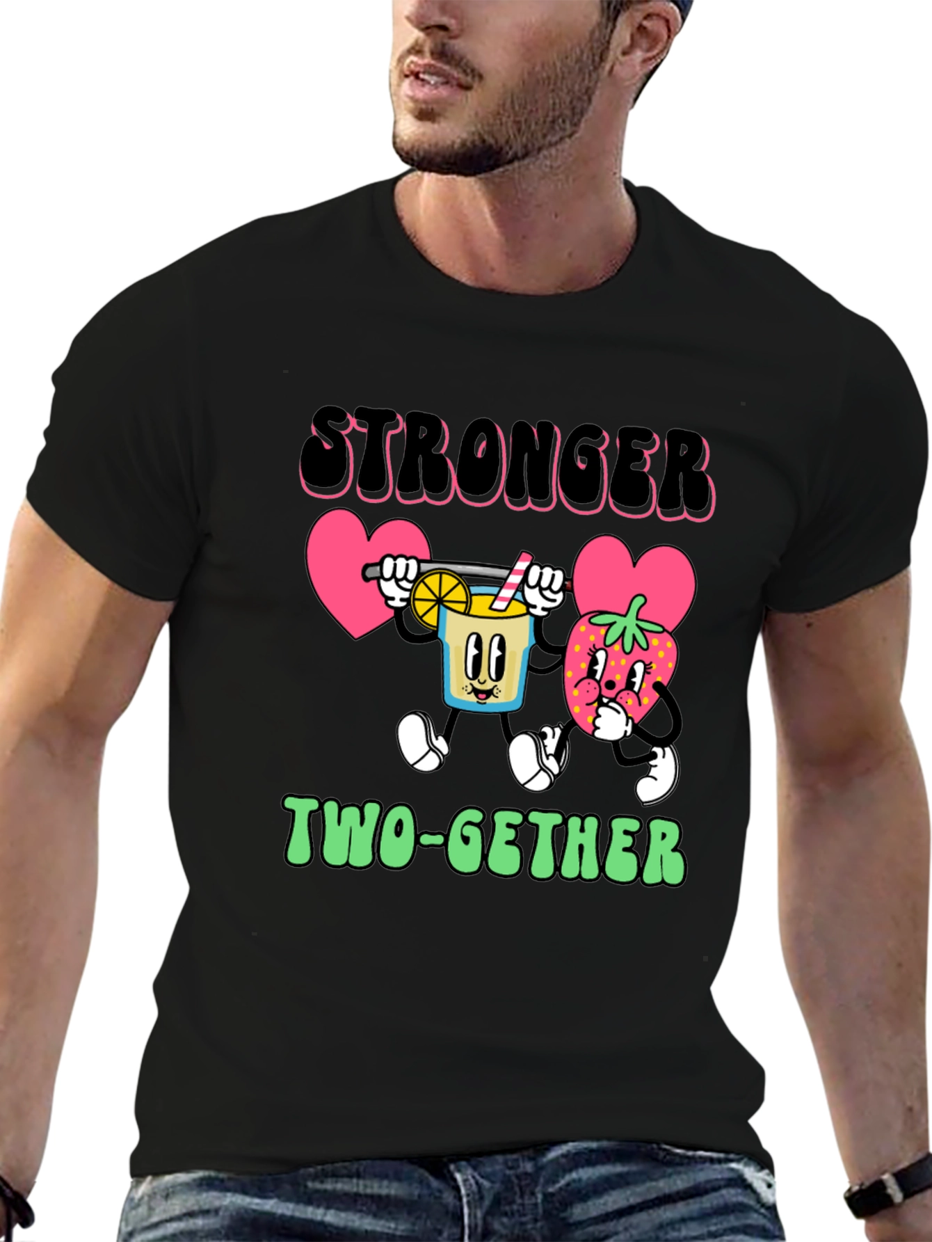 This black t-shirt features a playful graphic design that celebrates partnership and friendship. The design includes the words "Stronger" and "Two-Gether" in a retro, cartoonish font, accompanied by two adorable cartoon characters: a glass of lemonade and a strawberry. Each character is playfully styled with arms, legs, and expressive faces, adding a whimsical touch. Pink hearts flank the text, enhancing the loving and cheerful vibe. Ideal for casual wear, this tee is perfect for expressing a fun, positive message. The design is likely screen-printed, ensuring a vibrant and durable print. Show off your love for friendship and good vibes with this unique t-shirt!