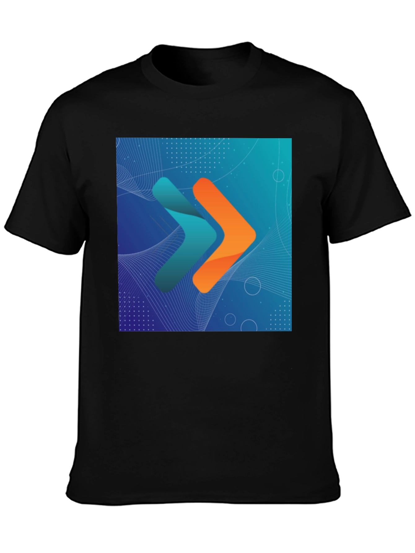 Elevate your casual style with this eye-catching black graphic tee. Featuring a vibrant design of layered arrows in teal and orange against a cool blue gradient backdrop, this shirt is sure to make a statement. The clean lines and modern aesthetic make it a versatile piece for any wardrobe. Made from a comfortable, breathable fabric, it's perfect for everyday wear, whether you're hanging out with friends or running errands. Pair it with jeans or shorts for a relaxed yet stylish look. This tee is a must-have for those who appreciate contemporary design and effortless style.