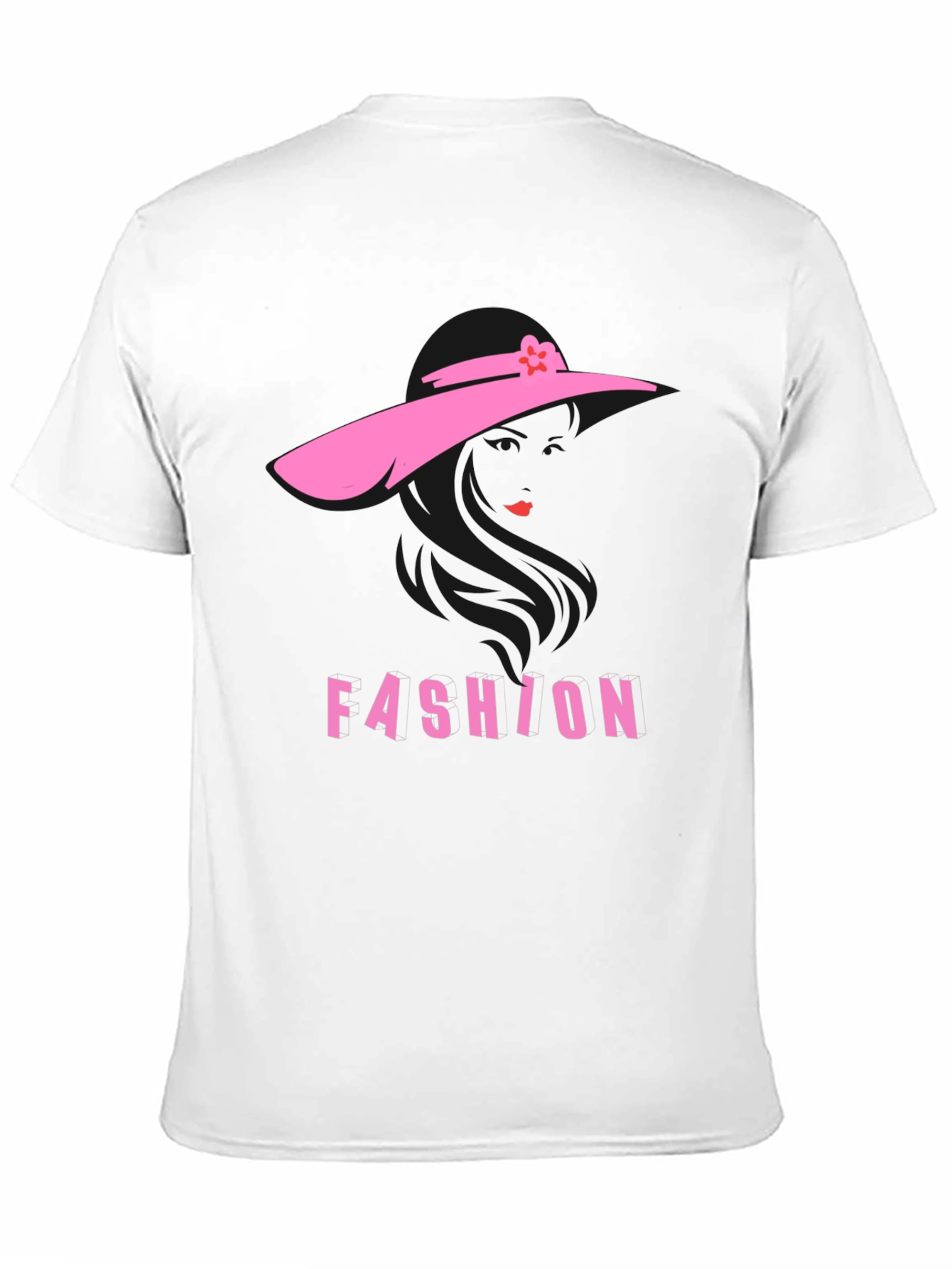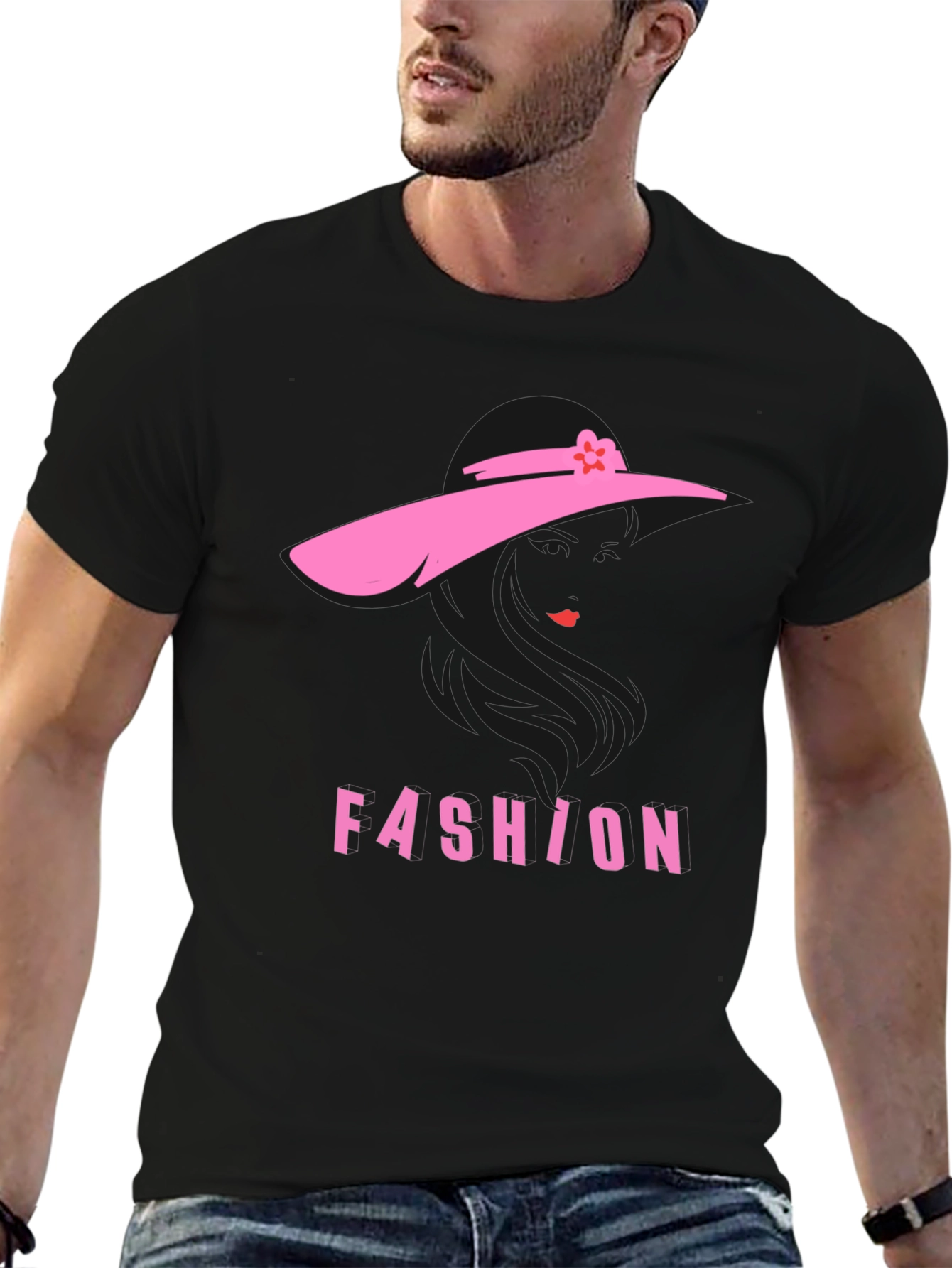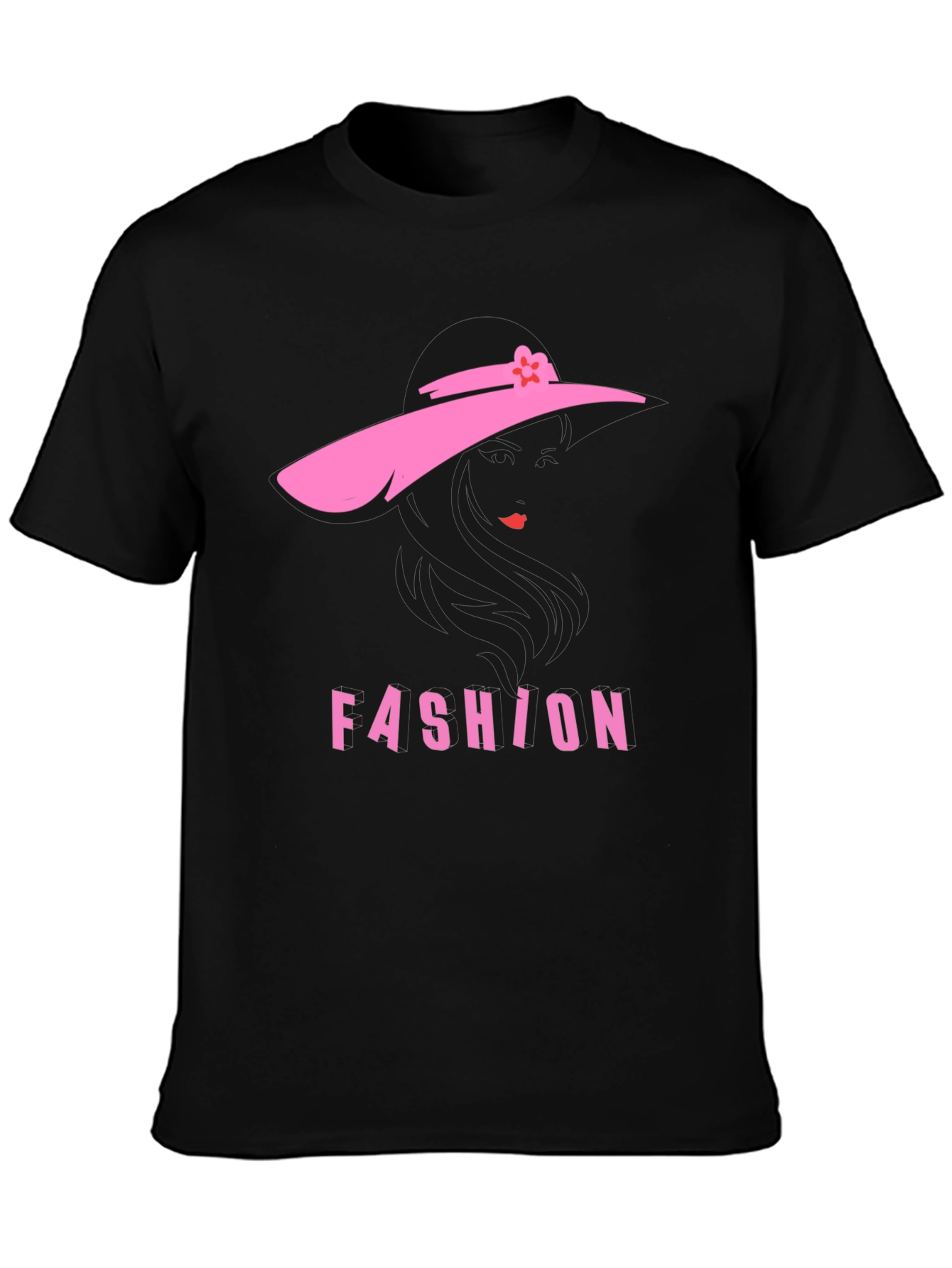 Elevate your wardrobe with this eye-catching black t-shirt. Featuring a unique pink silhouette design of a woman wearing a hat, complemented by the word "FASHION" in bold pink letters, this shirt effortlessly blends style and comfort. The design adds a touch of chic sophistication, making it a standout piece for casual outings or stylish events. Made from comfortable materials, this tee is perfect for everyday wear. Showcase your fashionable side with this must-have addition to your collection. Ideal for trendsetters and fashion enthusiasts alike.