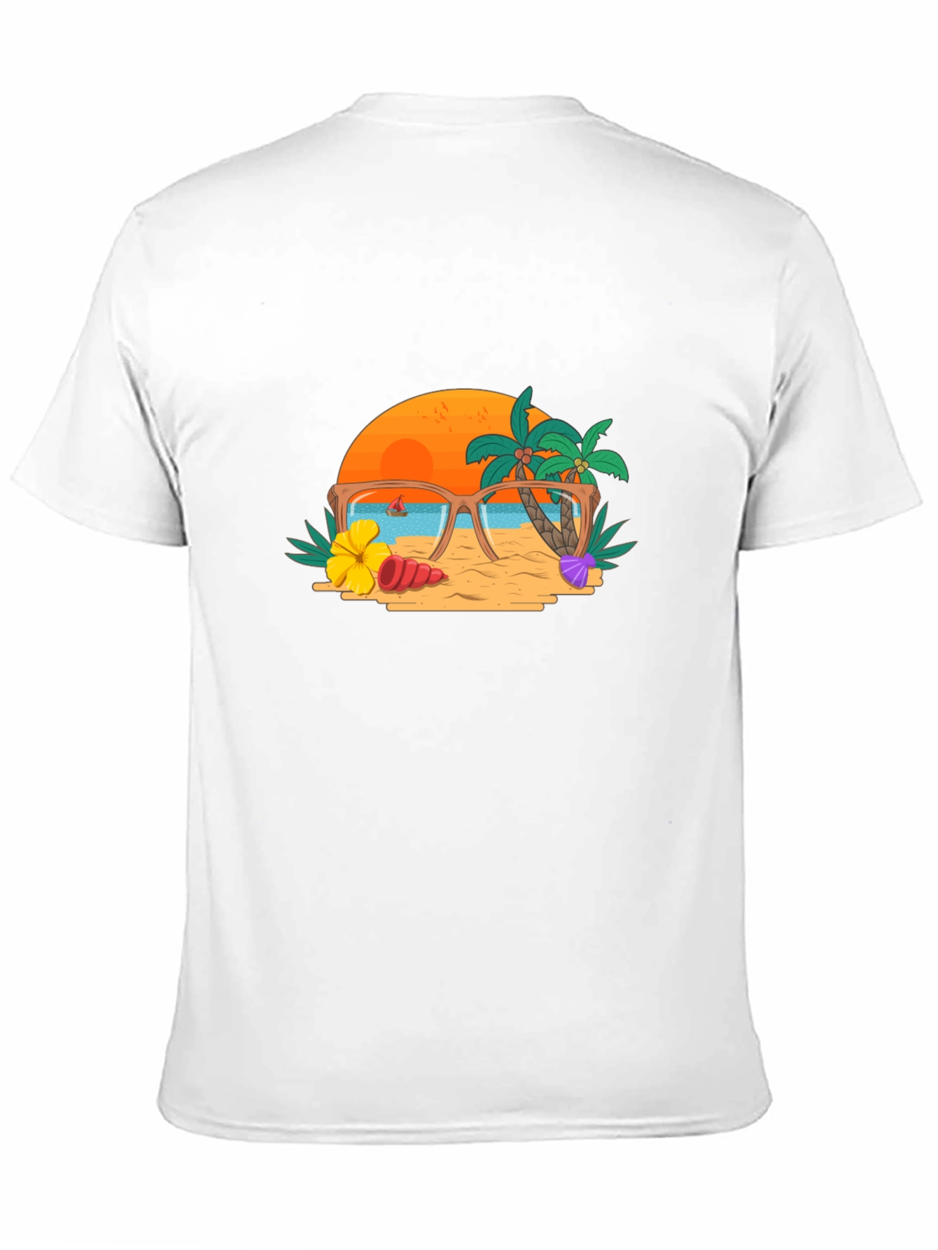 Embrace the warmth of summer with this unique graphic tee. The shirt showcases a vibrant beach scene with sunglasses reflecting a sunny day. Palm trees, a golden sunset, and ocean waves evoke a sense of relaxation and vacation vibes. Perfect for casual outings, beach trips, or summer festivals, this tee adds a touch of personality to your wardrobe. Made from comfortable fabric, it ensures a soft and breathable feel. Stand out with this eye-catching design that captures the essence of summer fun and carefree style.