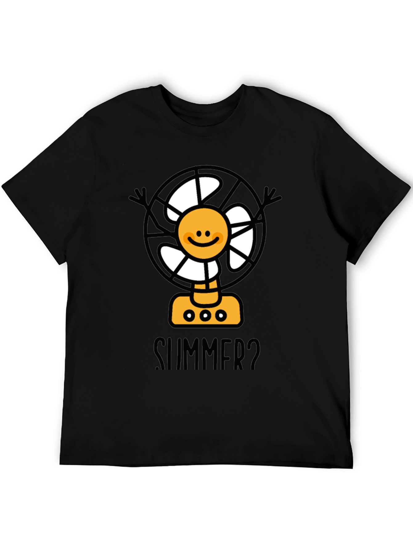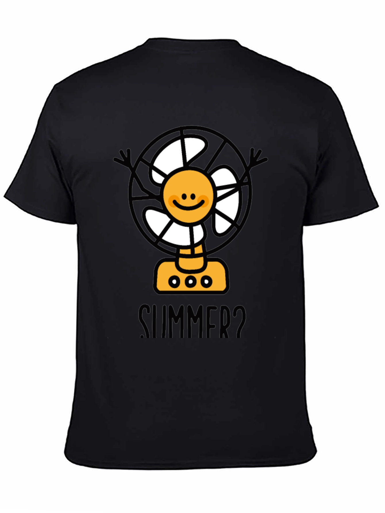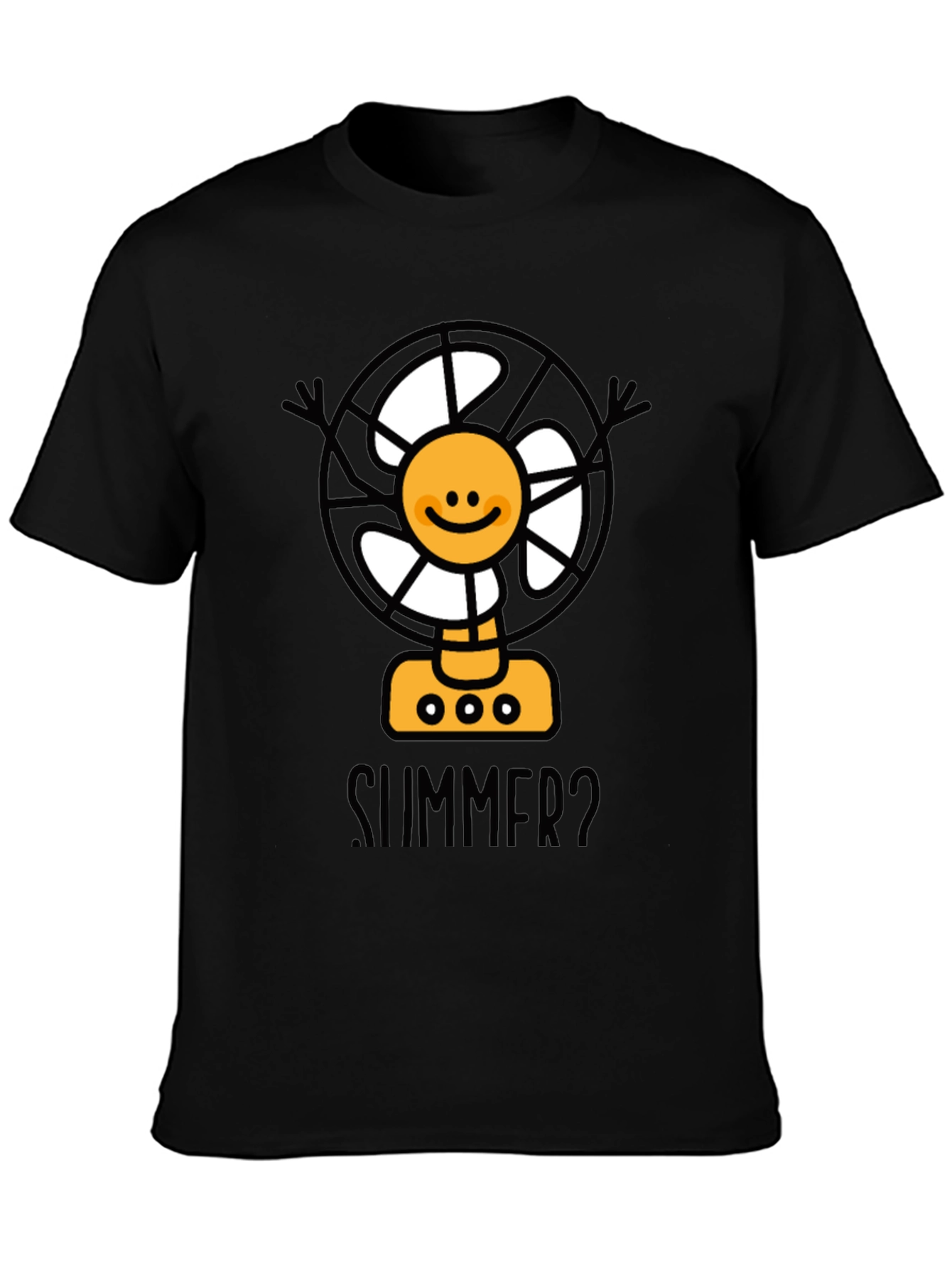 Stay cool and stylish with this unique Summer Fan T-shirt. Featuring a playful cartoon fan design with a smiley face, this black tee is perfect for hot days. The design includes the word "SUMMER?" adding a touch of humor. Made from a comfortable fabric, it's ideal for casual wear, summer outings, or as a fun gift. Show off your love for summer with this eye-catching and comfortable T-shirt. Perfect for everyday wear and sure to bring a smile to everyone's face.