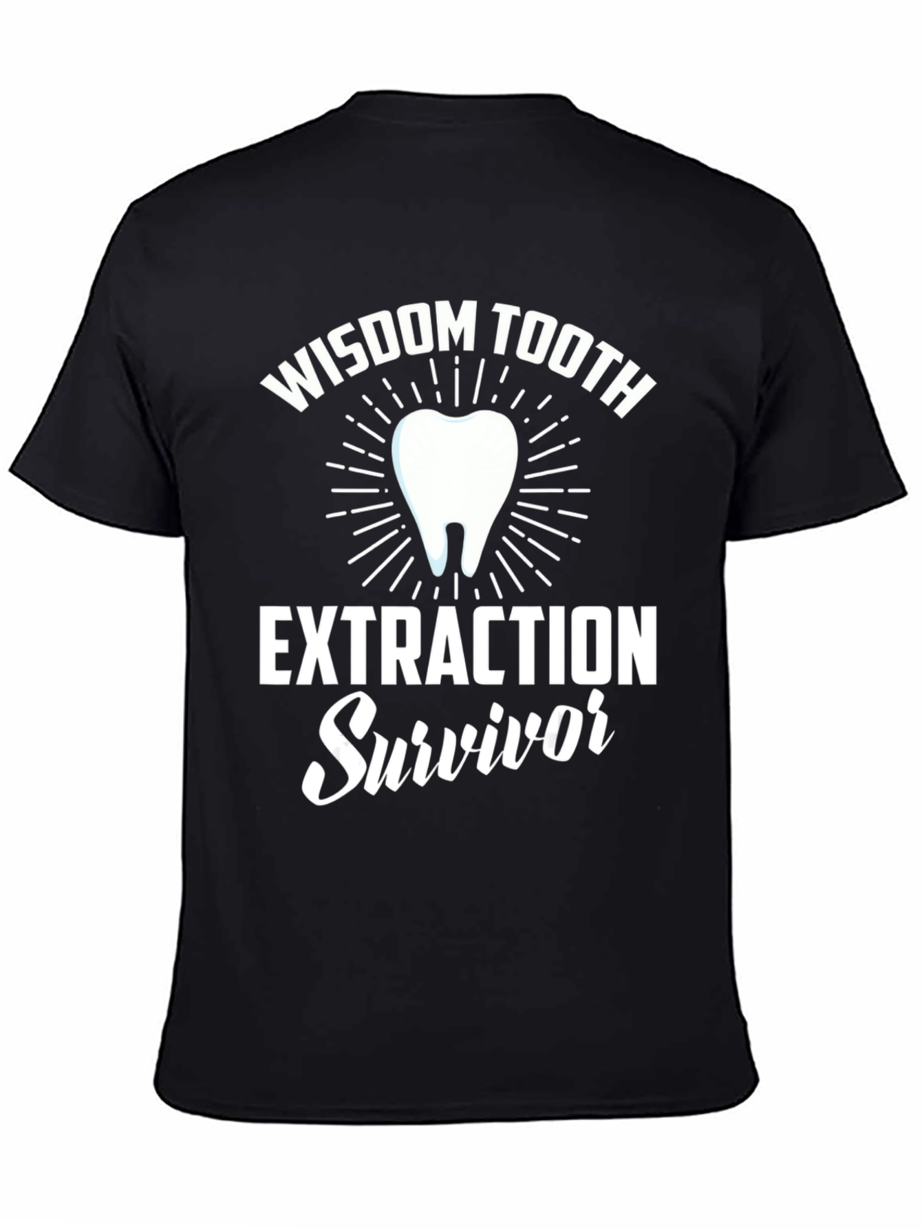 This black graphic tee celebrates conquering a dental milestone! The shirt features bold white text reading 'WISDOM TOOTH EXTRACTION SURVIVOR,' with a stylized tooth graphic. The clean design makes it perfect for dentists, dental hygienists or patients recovering from oral surgery. It's a great way to show off a sense of humor during recovery or as a gag gift for someone about to undergo the procedure. Made from comfortable, breathable fabric, this T-shirt is ideal for everyday wear or post-operative comfort. A fun and lighthearted way to commemorate the wisdom tooth journey!