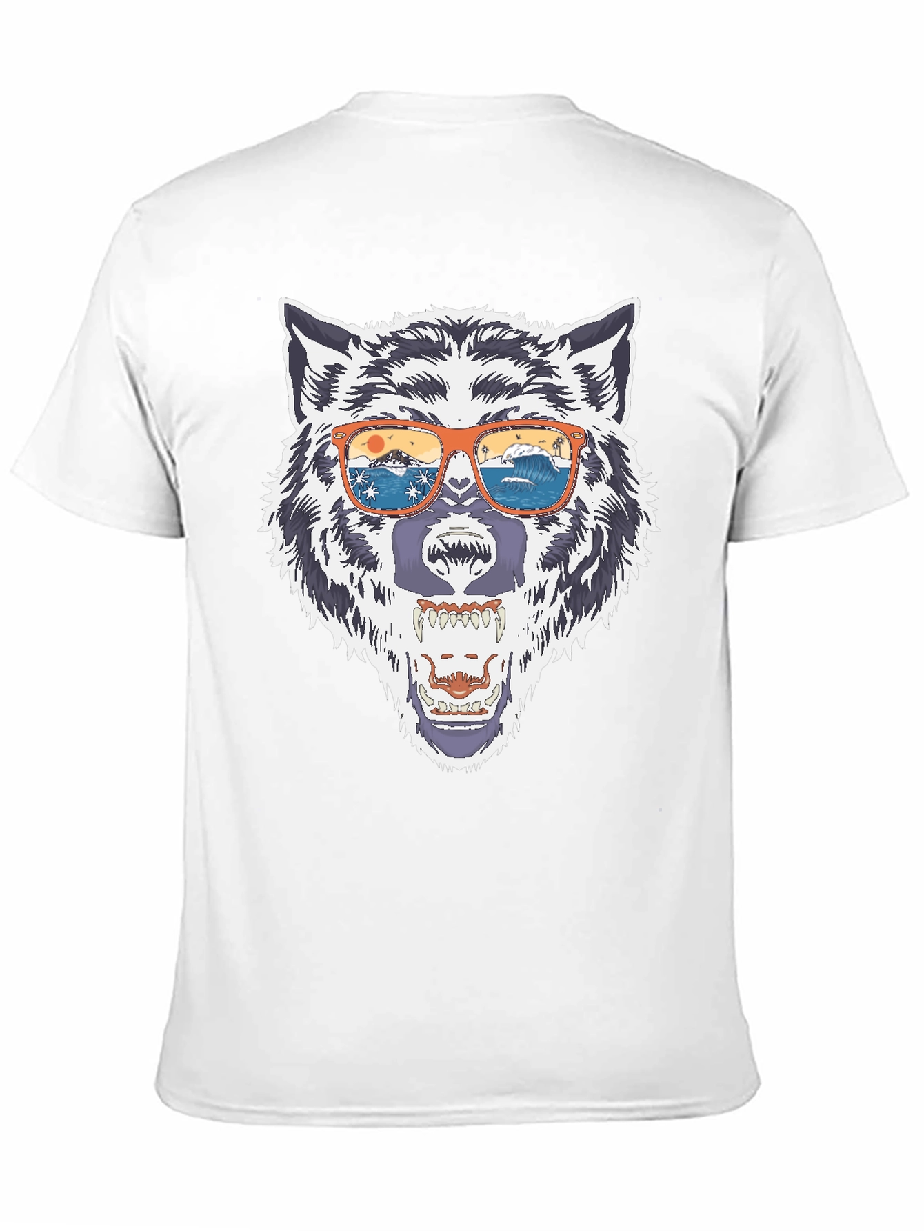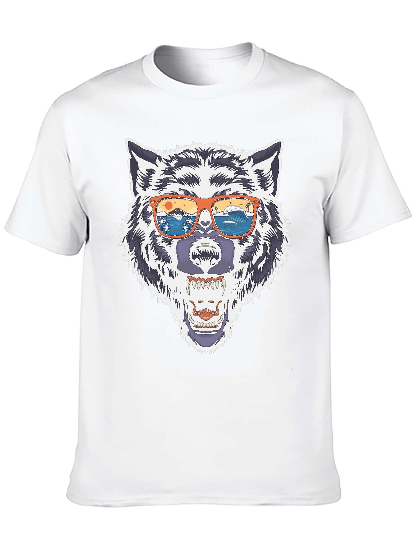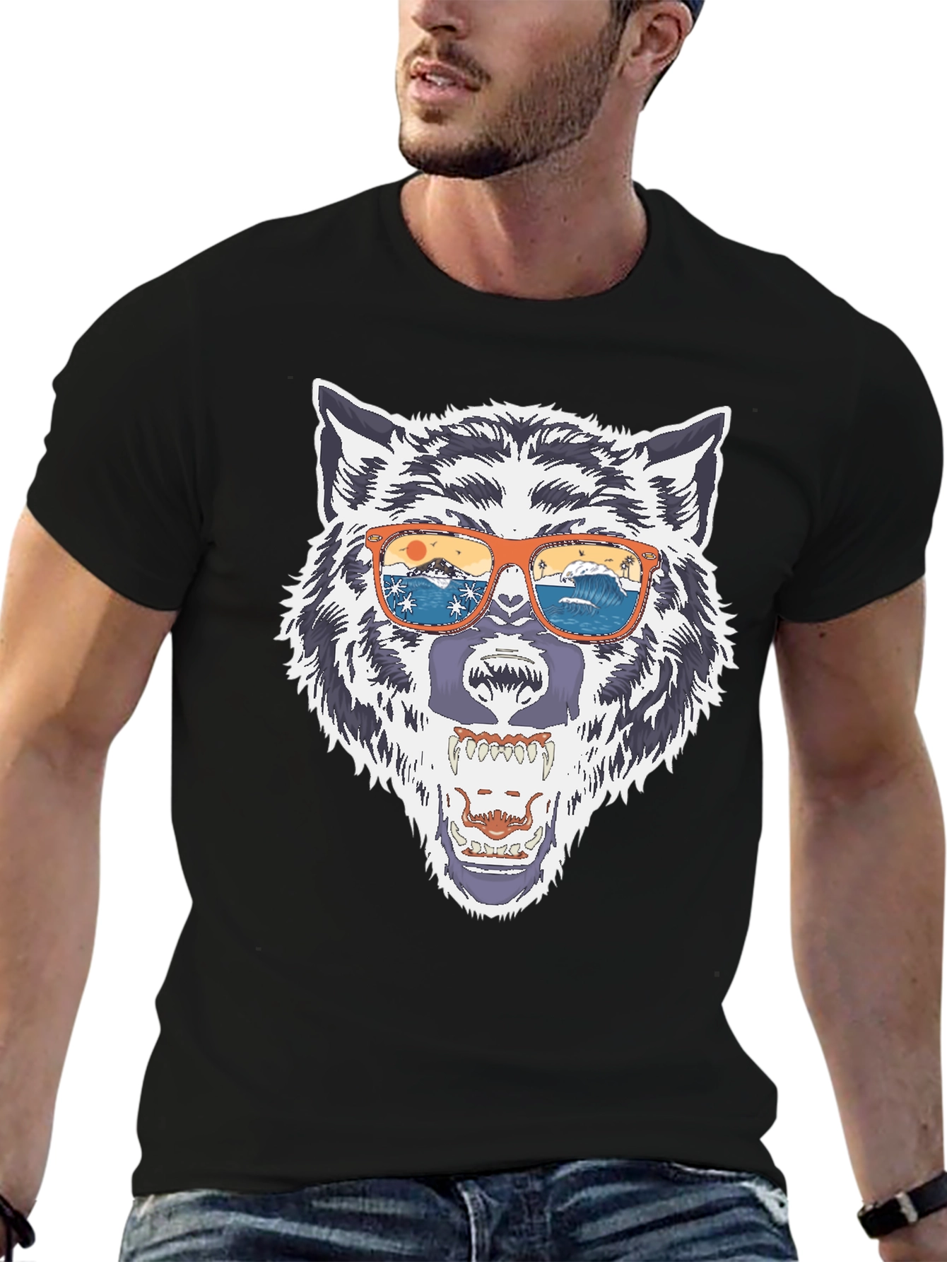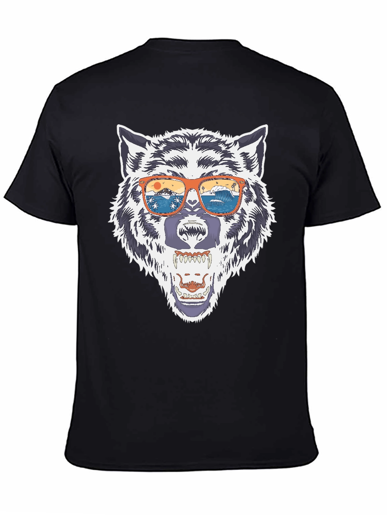 Show off your wild side with this eye-catching black t-shirt! This comfortable tee features a bold graphic of a wolf head sporting stylish orange sunglasses, complete with a striking beach scene reflection. The detailed design captures the essence of both the animal kingdom and the laid-back beach lifestyle. Made from a soft and breathable fabric, it's perfect for everyday wear, casual outings, or making a statement wherever you go. Unleash your inner wolf and add this unique t-shirt to your wardrobe today! Get yours now and turn heads.
