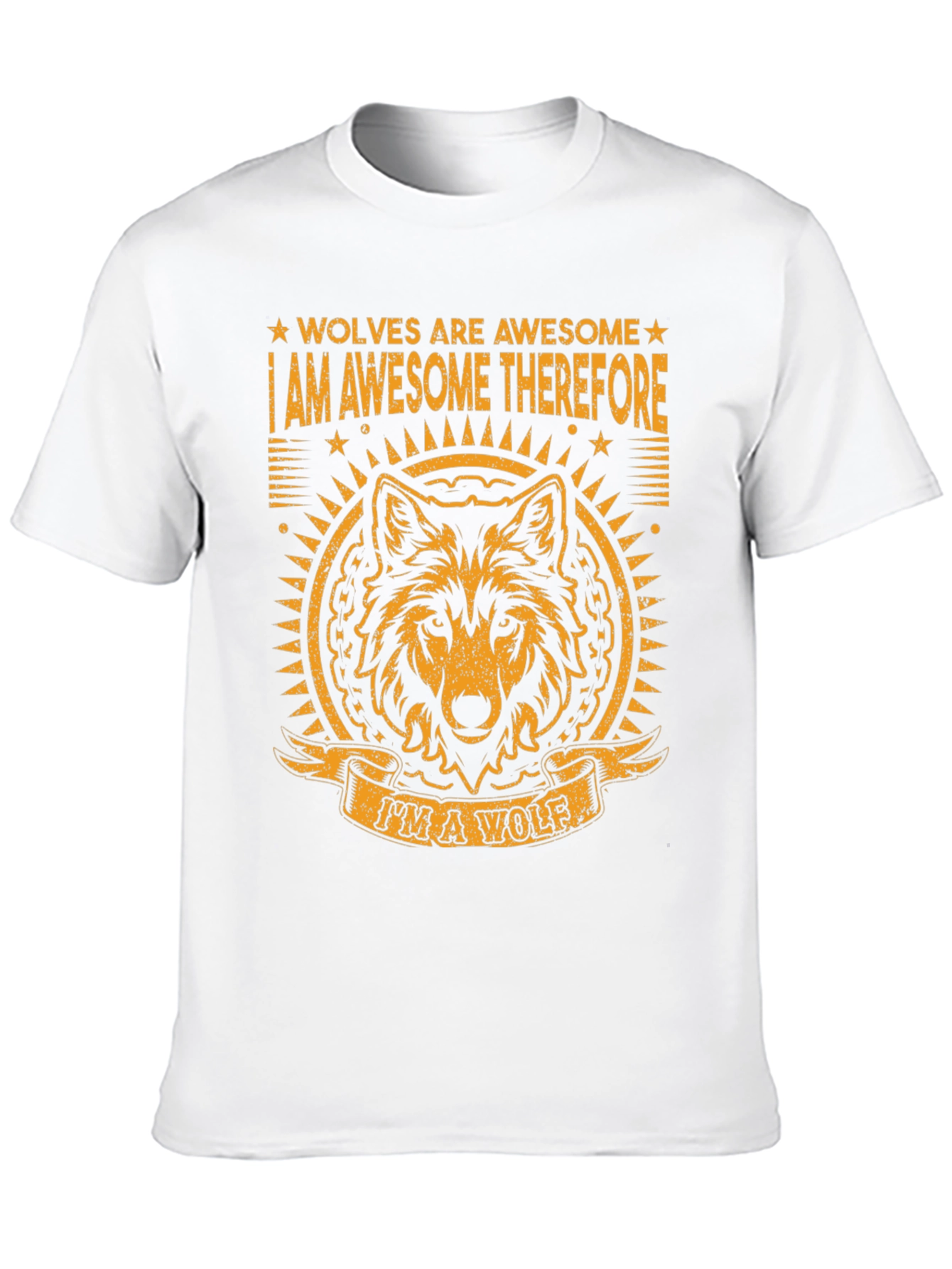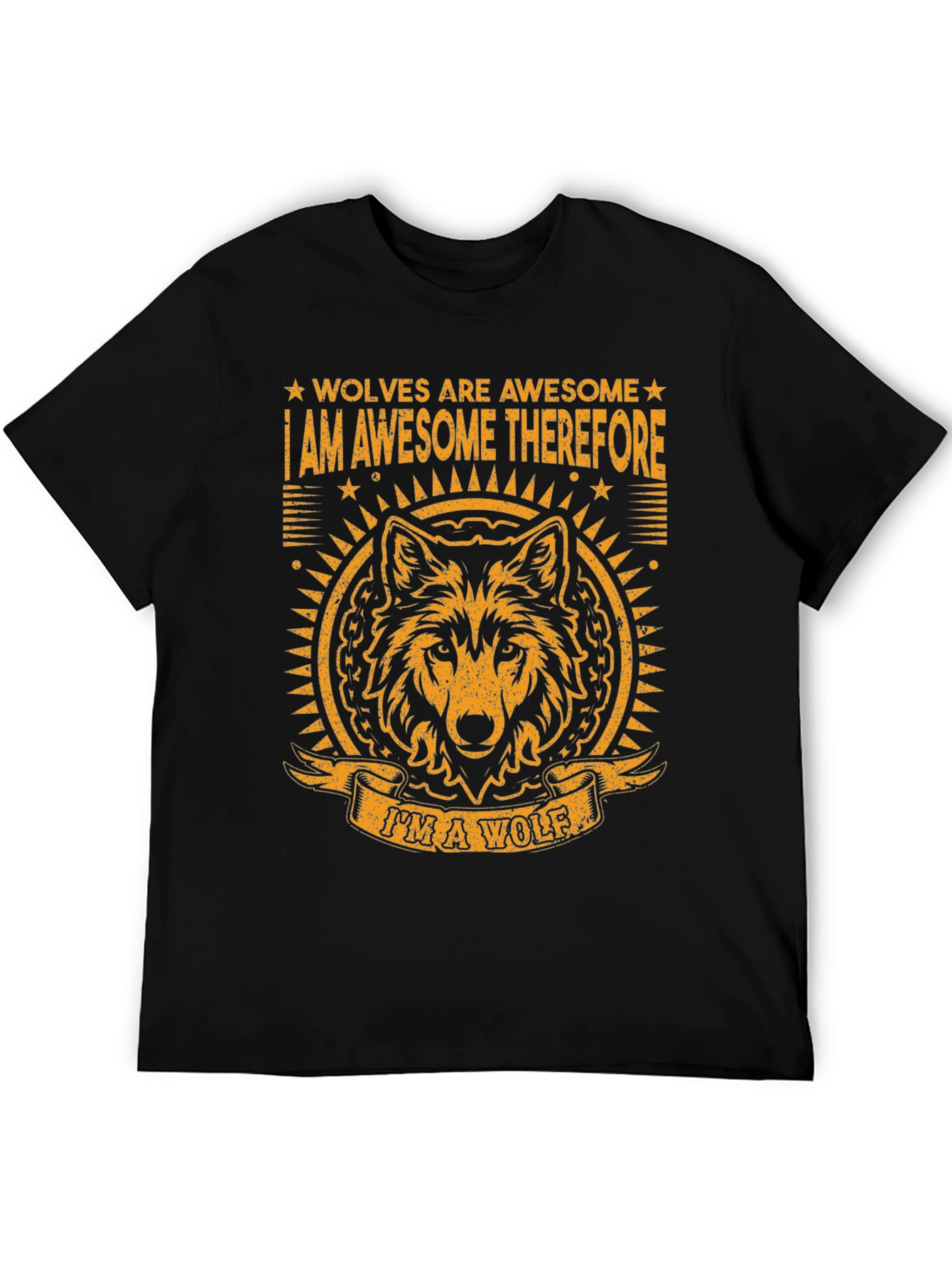 Show your love for wolves with this eye-catching graphic tee. This black t-shirt features a striking orange design that reads "Wolves Are Awesome I Am Awesome Therefore I'm A Wolf", complete with a detailed wolf head graphic. The bold design and comfortable fit make it perfect for casual wear, expressing your unique style, or as a gift for wolf enthusiasts. Made from a soft and breathable fabric, this tee is ideal for everyday wear and sure to turn heads. Express your wild side with this one-of-a-kind t-shirt!