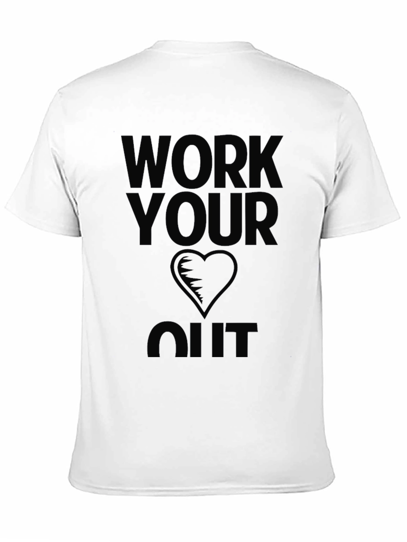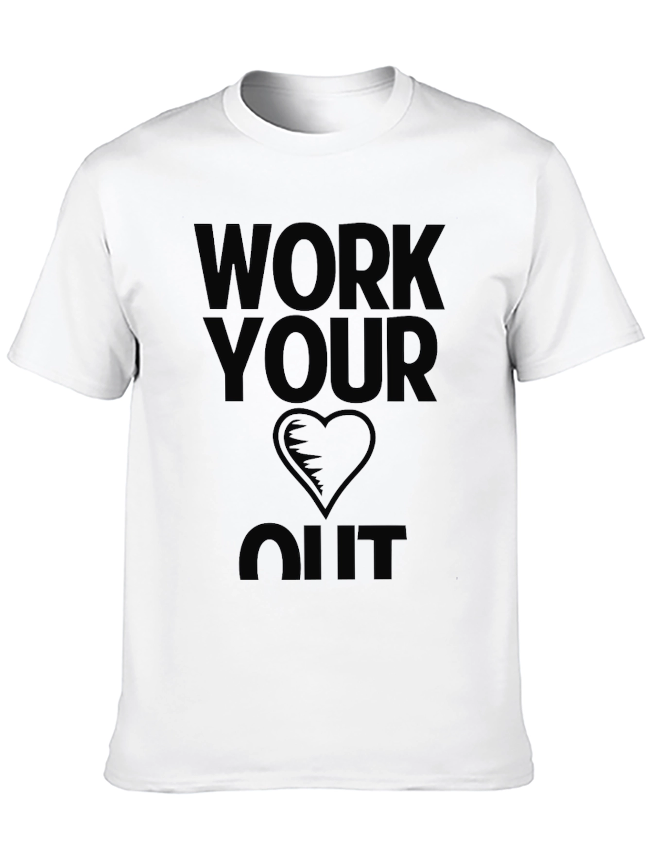 This classic black t-shirt features a bold graphic design, perfect for workout enthusiasts or anyone looking to make a statement. The design includes the phrase "WORK YOUR HEART OUT" in a striking, vertically-stacked layout, with a stylized heart symbol in the center. Made from what appears to be a soft and breathable fabric, this tee promises all-day comfort. Its versatile style makes it suitable for the gym, casual outings, or layering under a jacket. Show off your dedication to fitness and a healthy lifestyle with this eye-catching and comfortable t-shirt.