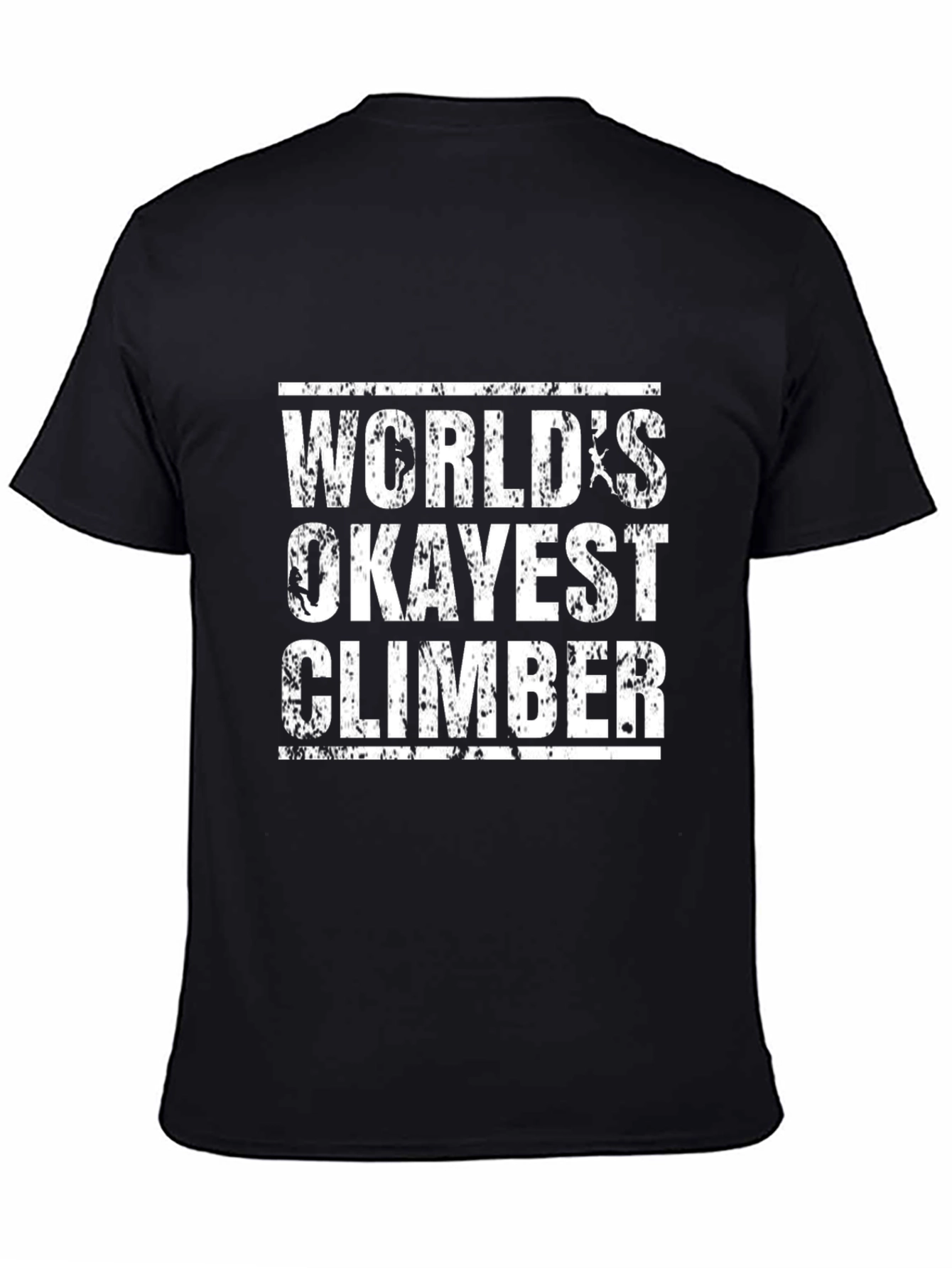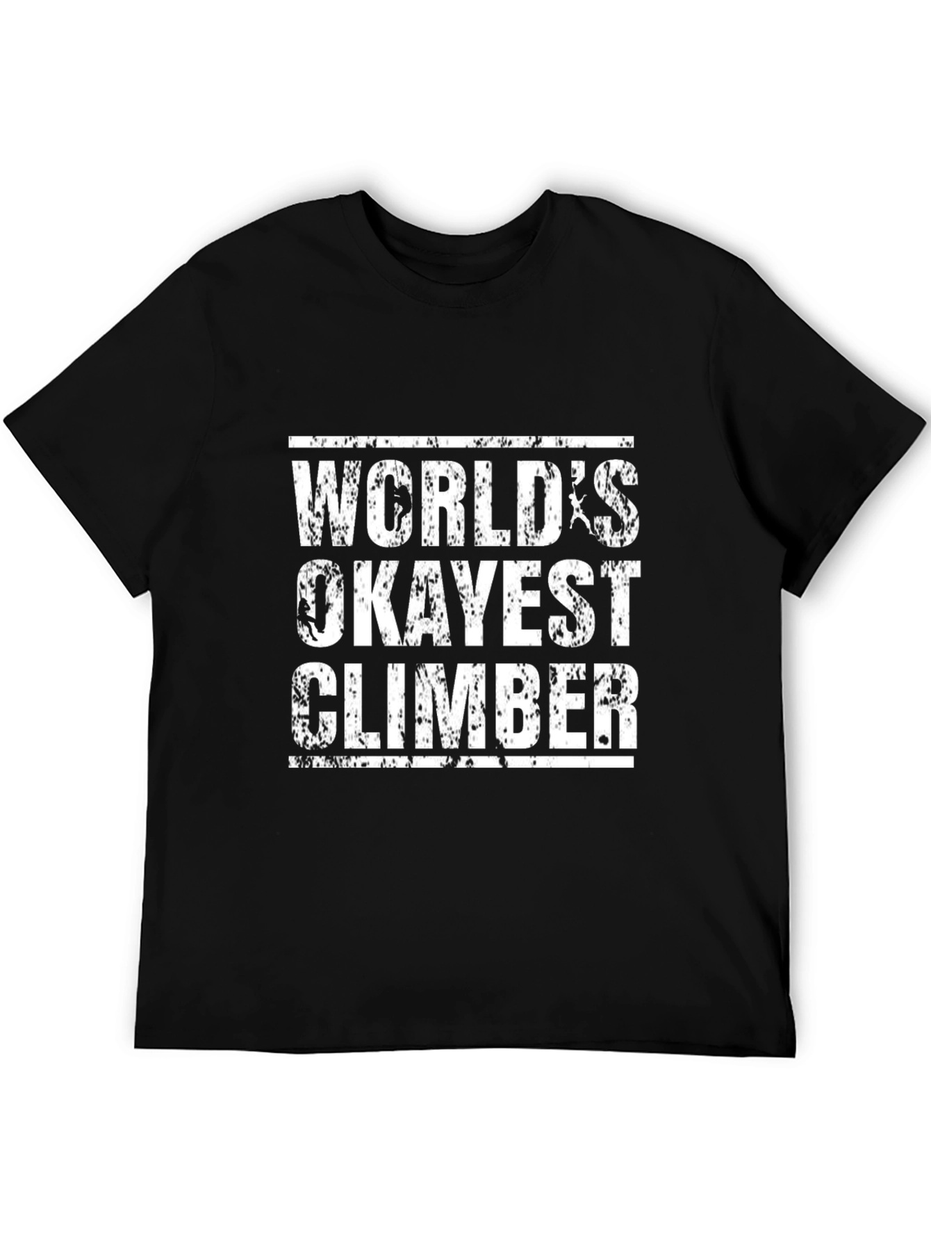 Show off your climbing enthusiasm with this fun black graphic t-shirt. The bold white distressed print features the phrase "World's Okayest Climber" sandwiched between solid lines. Made from what appears to be a comfortable, soft cotton blend, this tee is perfect for casual wear, gym sessions, or hanging out with fellow climbing enthusiasts. It offers a classic fit that's both stylish and relaxed. A great conversation starter and a must-have addition to any climber's wardrobe. It’s the perfect way to express your love for the sport with a touch of humor. Get yours today!